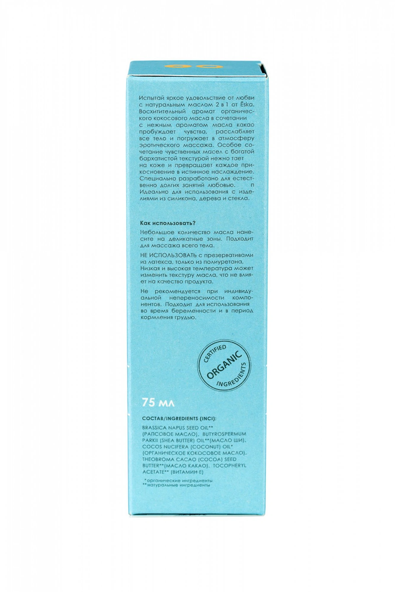 Испытай яркое удовольствие от любви с натуральным маслом 2 в 1 от Ёska. Восхитительный аромат органического кокосового масла в сочетании с нежным ароматом масла какао пробуждает чувства, расслабляет все тело и погружает в атмосферу эротического массажа. Особое сочетание чувственных масел с богатой бархатистой текстурой нежно тает на коже и превращает каждое прикосновение в истинное наслаждение. Специально разработано для естественно долгих занятий любовью. Идеально для использования с изделиями из силикона, кожи, дерева и стекла.