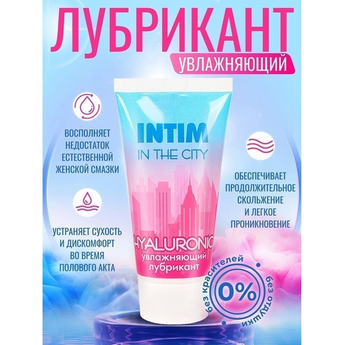 Лубрикант Intim in the city hyaluronic увлажняет и смягчает ткани половых органов, устраняет сухость влагалища. Во время полового акта обеспечивает приятное продолжительное скольжение, восполняет недостаток естественной женской смазки, препятствует появлению микротравм. Входящая в состав лубриканта гиалуроновая кислота нормализует водный баланс клеток, способствует регенерации кожи и слизистых, обеспечивает эластичность тканей интимных зон, снижает чувствительность кожи, усиливает её защитные функции. Лубрикант Intim in the city hyaluronic обеспечивает бережный уход за интимными зонами женщин и мужчин. Не липнет, легко смывается водой.