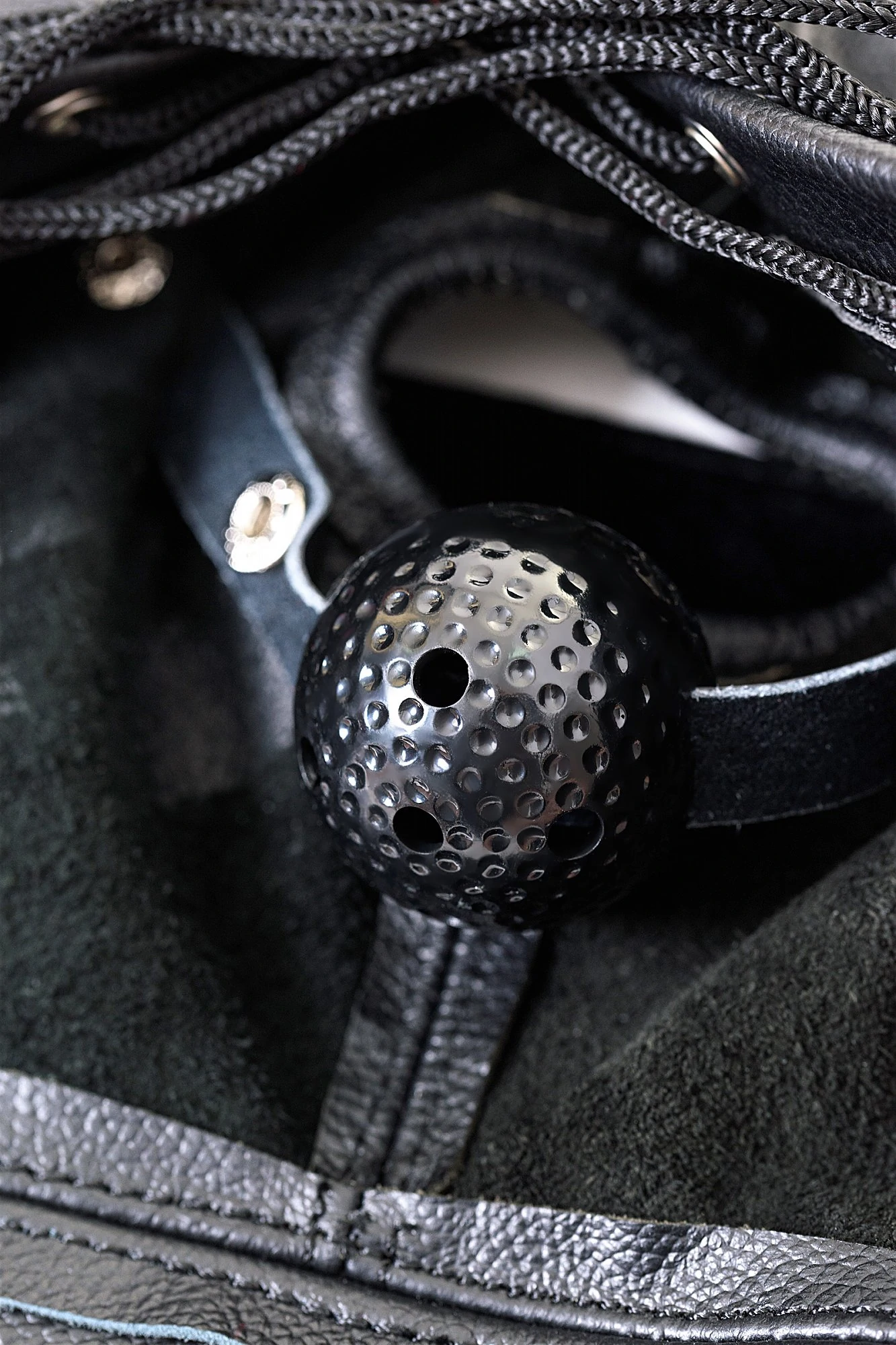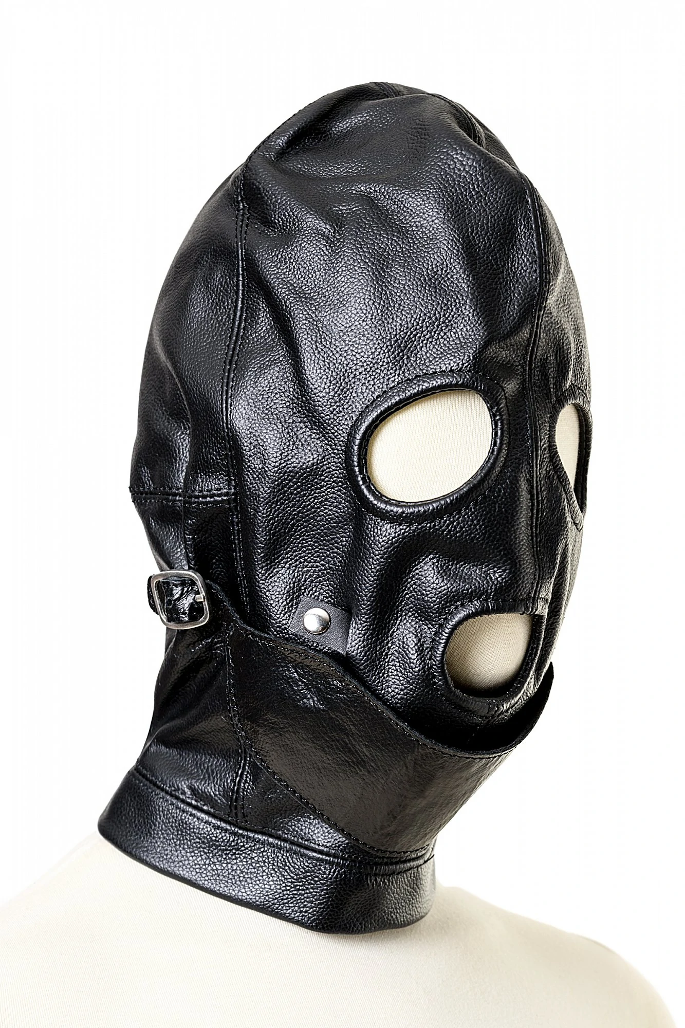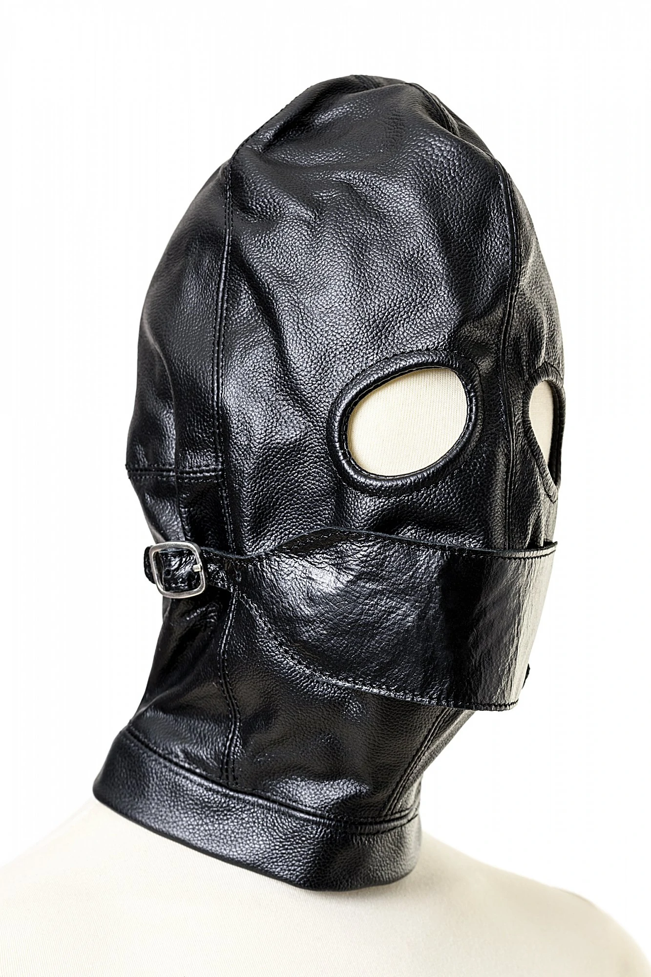 Кожаная маска с открытыми глазами под кожаным отстегивающимся клапаном спрятан пластиковый кляп.