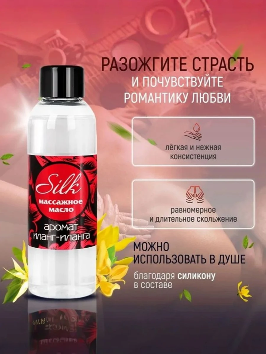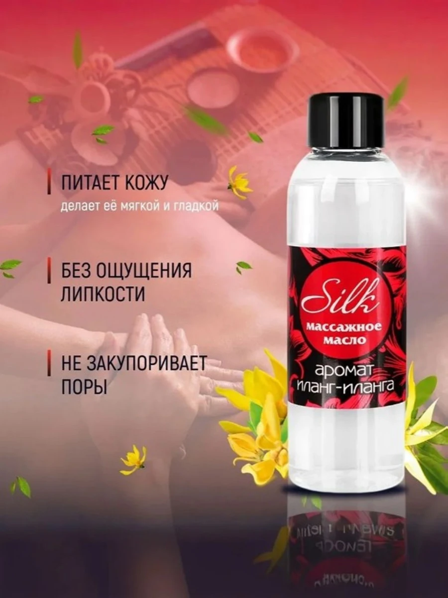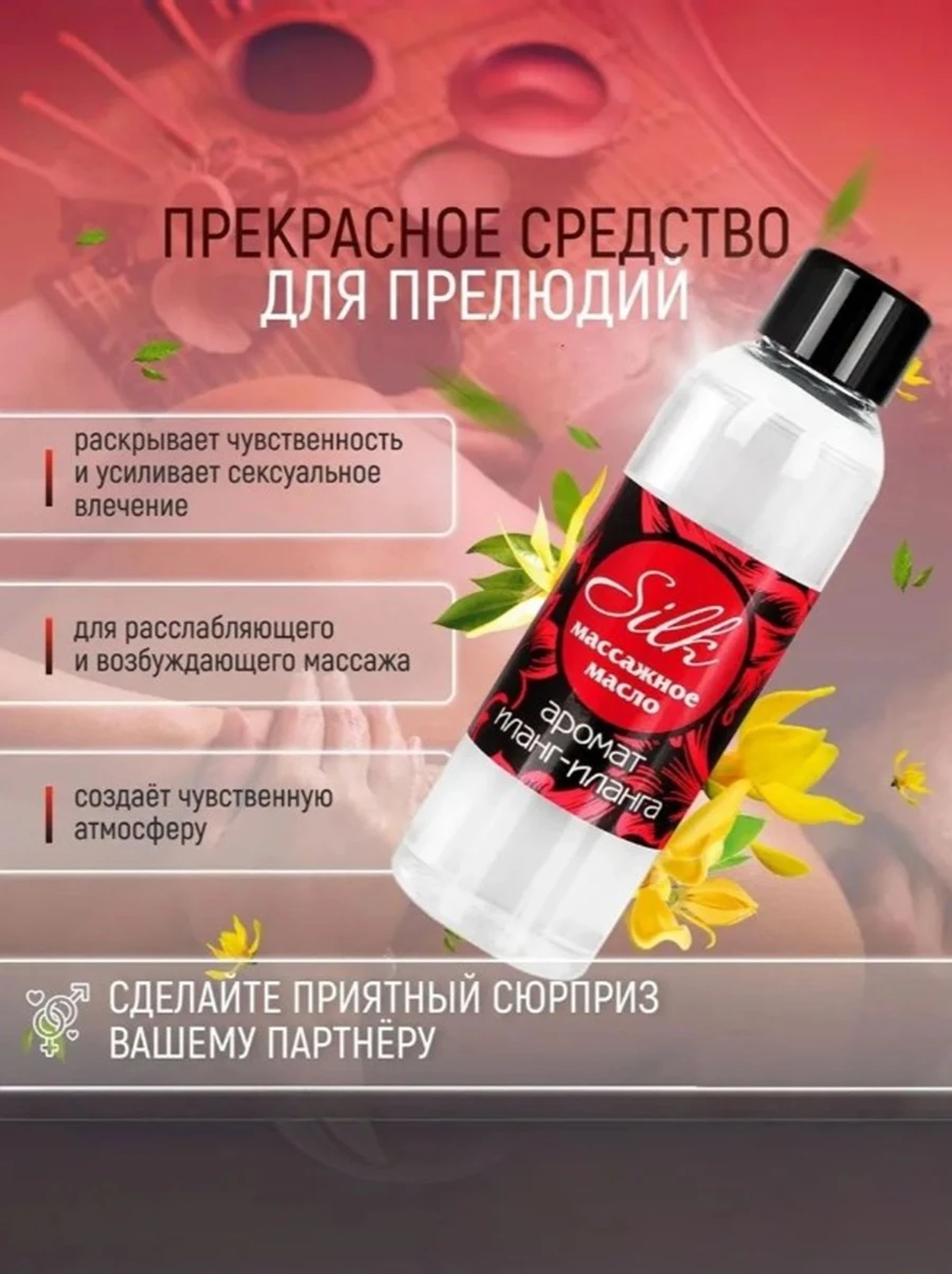 Приобщиться к особому искусству – жизни в гармонии с собой, своим телом и основным инстинктом – поможет масло «Silk». Тонкий возбуждающий аромат иланг-иланга в составе создает эротическое настроение. Нежное, легкое масло для массажа обеспечивает равномерное и длительное скольжение. Придает коже шелковистость и мягкость. Приносит пользу телу и поднимет настроение. Объем: 75 мл.