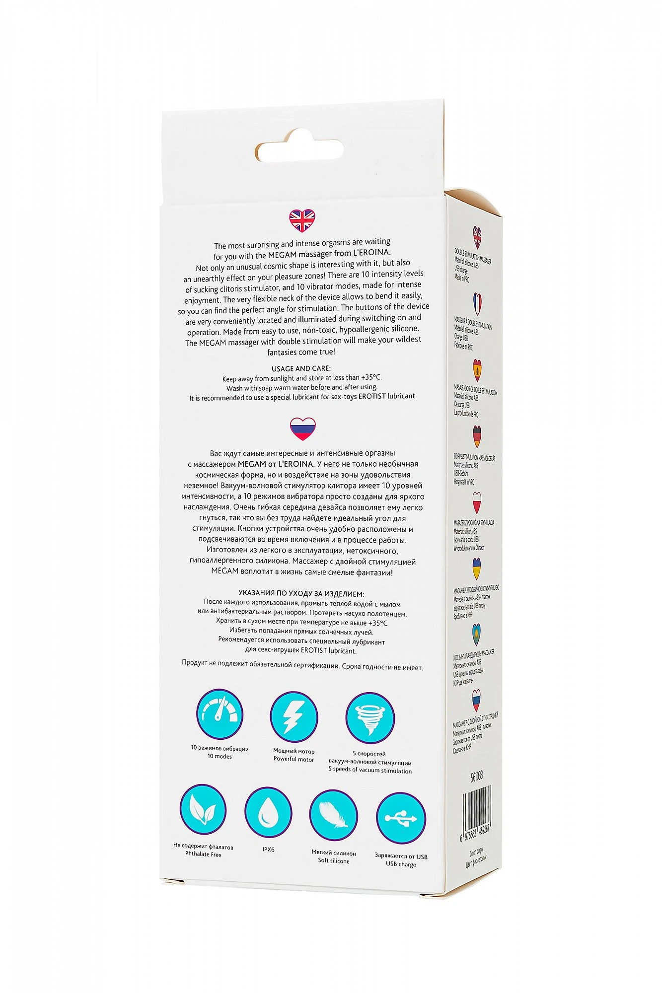 Желаете испытать самые незабываемые и сильные оргазмы? Тогда вибромассажер с вакуумной стимуляцией Megam от бренда L’Eroina - именно то, что вам нужно! Его уникальная космическая форма и эйфорическое воздействие на зоны удовольствия приведут вас к неземным ощущениям. Этот вакуум-волновой стимулятор клитора имеет 10 уровней интенсивности, а 10 режимов погружной вибрирующей части созданы для яркого наслаждения и массажа зоны G. Гибкая середина устройства легко гнется, позволяя вам легко найти идеальный угол для стимуляции. Кнопки Megam расположены удобно на корпусе и подсвечиваются во время использования. Изготовлен массажер из легкого в эксплуатации, нетоксичного и гипоаллергенного силикона. С помощью интимной игрушки Megam и двойной стимуляции, воплотить в жизнь самые смелые фантазии станет легче легкого. Размер: общая длина 27,5 см, длина погружной части 19 см, диаметр погружной части 3,5 см, длина вакуумного стимулятора 12,5 см, диаметр вакуумного отверстия 1,5 см. Цвет: фиолетовый.