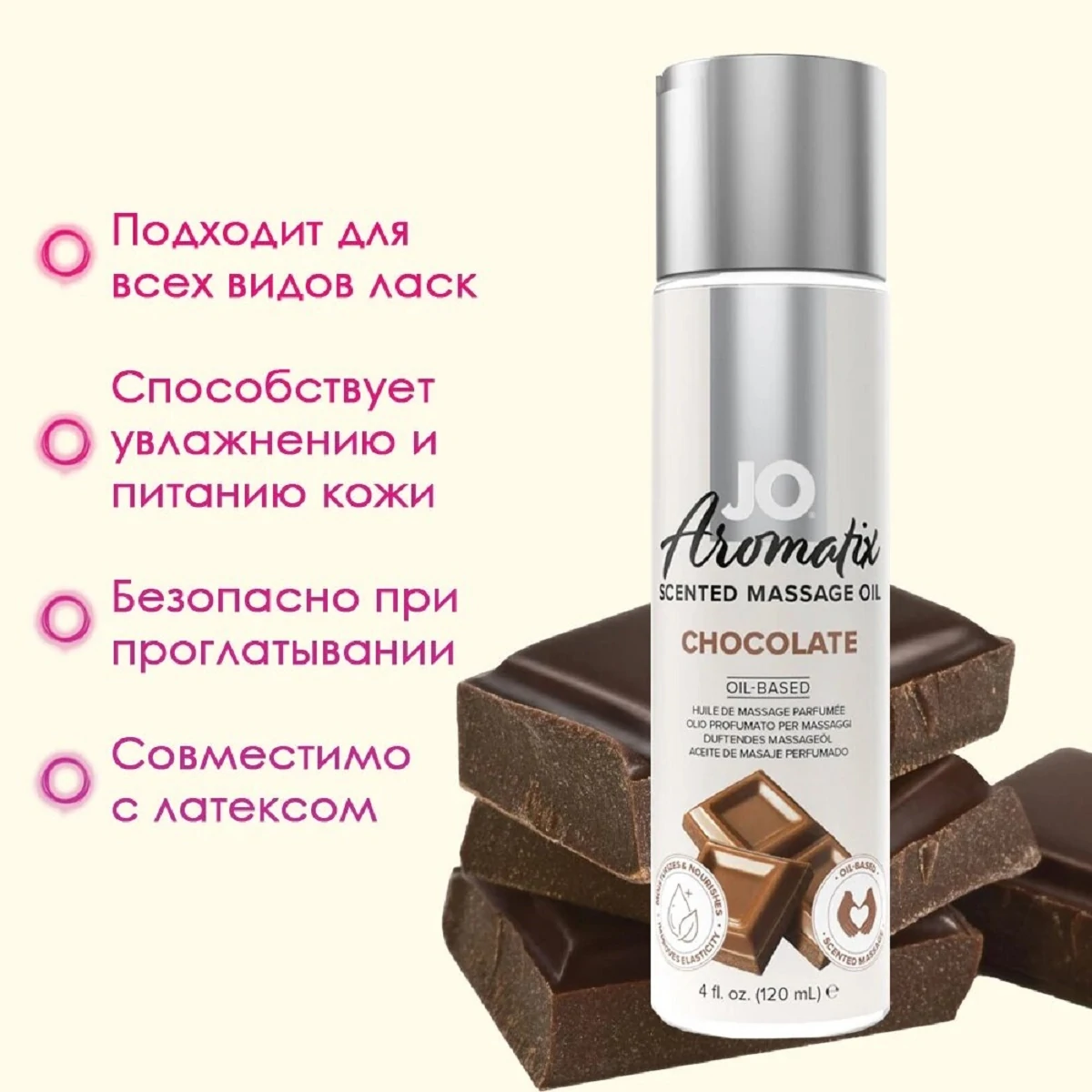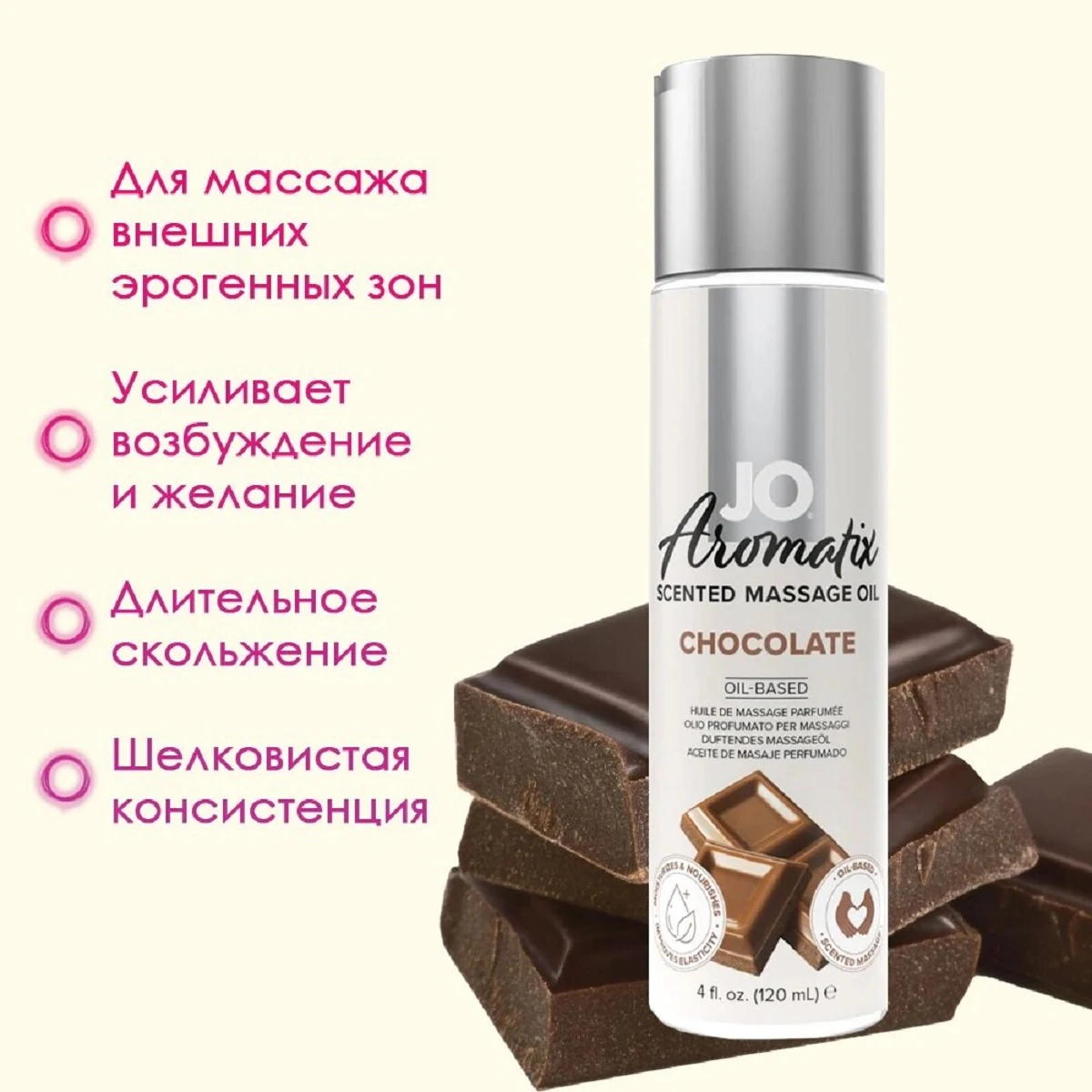 Массажное масло для поцелуев с феромонами и афродизиаками Шоколадный мусс предназначено для эротического расслабляющего массажа. Входящие в состав феромоны и природные афродизиаки пробуждают страсть. Масло можно слизывать, что делает игру более чувственной. Сбалансированная косметическая масляная основа, композиция натуральных ароматов и витаминов - Е, А, С, D заботятся о нежной коже, делая её сияющей, ухоженной, гладкой и шелковистой. Нежирная и длительная формула скольжения увлажняет и омолаживают кожу. Внимание! Масло нельзя добавлять в продукты питания или есть как самостоятельное блюдо. Состав: соевое масло, натуральные пищевые ароматизаторы, витамин Е, масло семян плодов пассифлоры, масло семян цветка пассифлоры, оливковое масло, масло семян жожоба, кокосовое масло, масло семян фисташки, миндальное масло, глицерин, вода, экстракт корня пуэрария мирифика, огуречный экстракт, эстратетраенол. Объем: 120 мл.