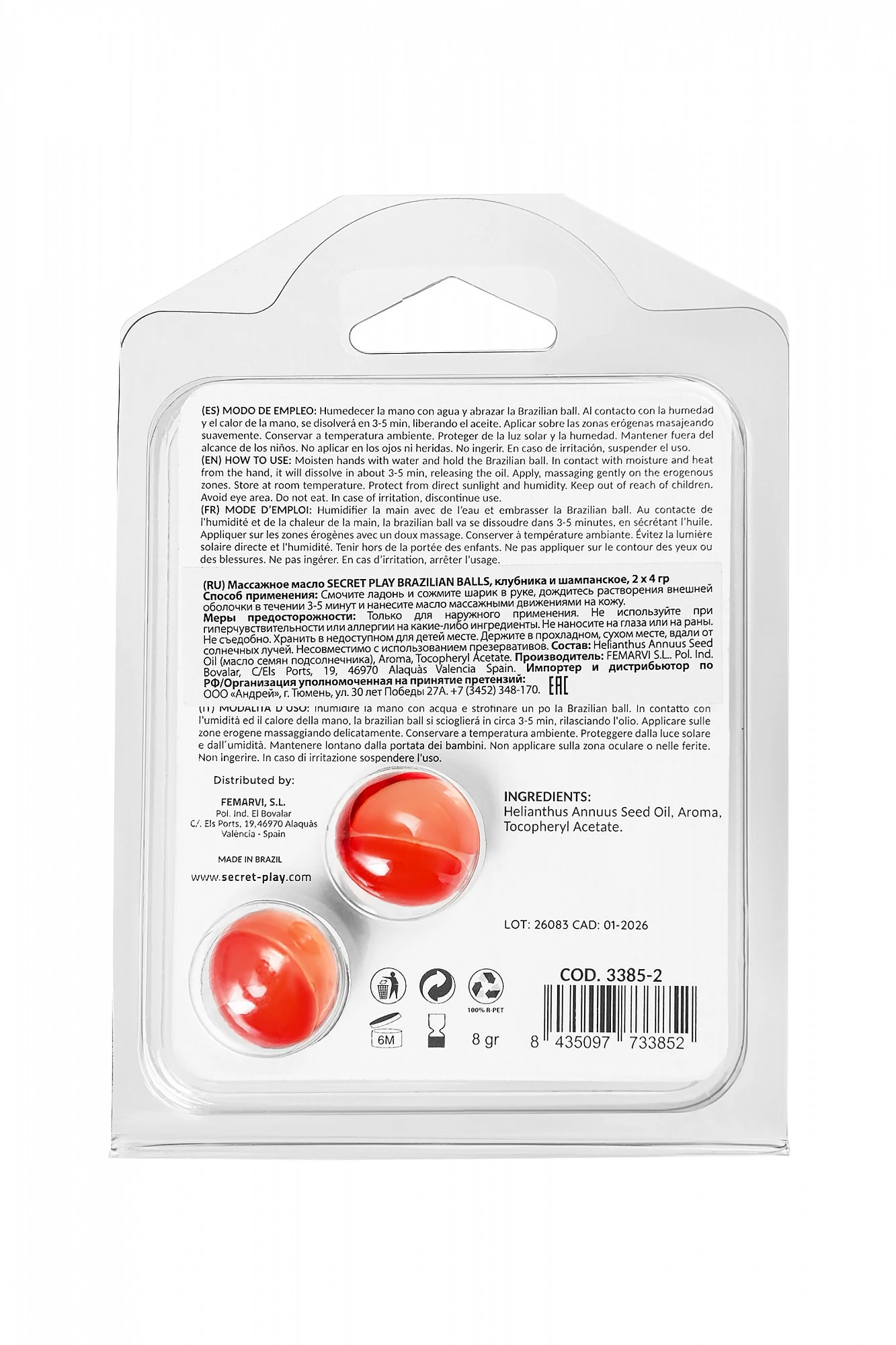 Brazilian Balls Strawberry Sparkling Wine это соблазнительное массажное масло от Secret Play, которое подарит вам незабываемые моменты страсти и наслаждения. Эти бразильские шарики созданы для тех, кто хочет добавить нотку романтики и игривости в свои интимные игры. Каждый шарик наполнен ароматным массажным маслом с восхитительным сочетанием клубники и игристого вина, которое будоражит чувства и создает атмосферу праздника и чувственности. Эти шарики тают в ваших руках, раскрываясь под воздействием тепла и влажности, и превращаются в шелковистое масло, идеально подходящее для мягких и чувственных прикосновений. Окунитесь в атмосферу наслаждения: легкий аромат клубники и игристого вина пробуждает все чувства, добавляя романтики и игривости в ваши интимные моменты. Просто смочите руку водой, обнимите шарик ладонью, и он начнет таять, превращаясь в масло с нежным ароматом клубники и игристого вина. В комплекте: 2 бразильских шарика по 4 грамма каждый.