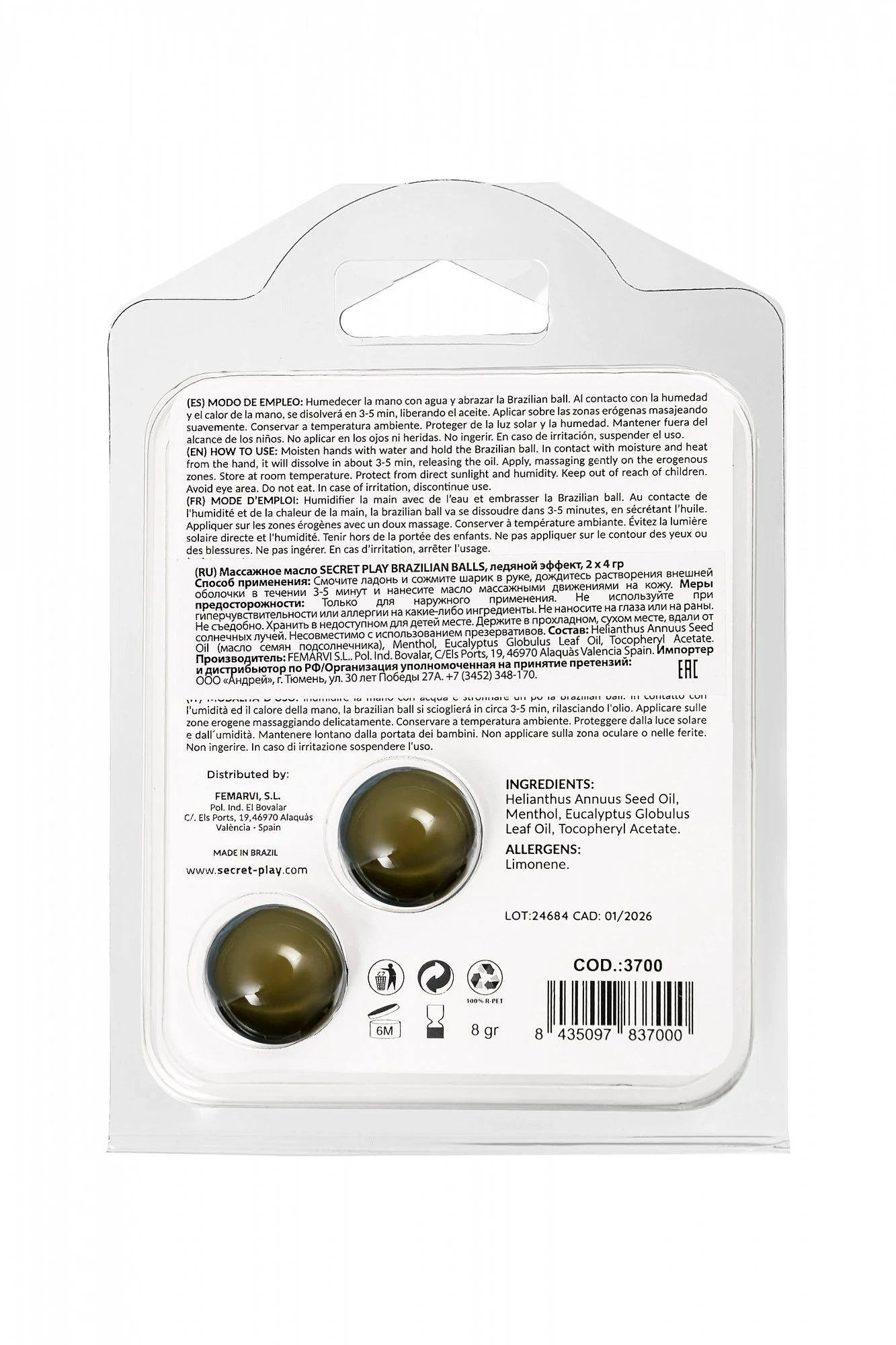 Почувствуйте настоящий взрыв свежести с бразильскими шариками Iceberg Effect! Эти уникальные массажные шары от бренда Secret Play созданы для тех, кто ищет незабываемые ощущения. Отправьтесь в мир чувственных удовольствий и испытайте эффект супер полярного холода, который окутывает ваше тело прохладой, оставляя ощущение легкости и прохлады на коже. Шарики Iceberg Effect сделают вашу прелюдию яркой и запоминающейся. Просто смочите руку водой, возьмите шарик и почувствуйте, как он начинает таять от тепла ваших ладоней, высвобождая охлаждающее массажное масло. Вдохните свежий аромат, который моментально погружает вас в состояние расслабления и романтики, а ледяной эффект пробудит ваше тело и обострит чувства, поднимая наслаждение на новый уровень. Подарите себе и своему партнеру приключение, полное удовольствий и новых эмоций. Эти шарики идеально подходят для создания атмосферы интима, когда каждая минута становится особенной, а каждое прикосновение – незабываемым. 2 бразильских шарика по 4 грамма каждый.