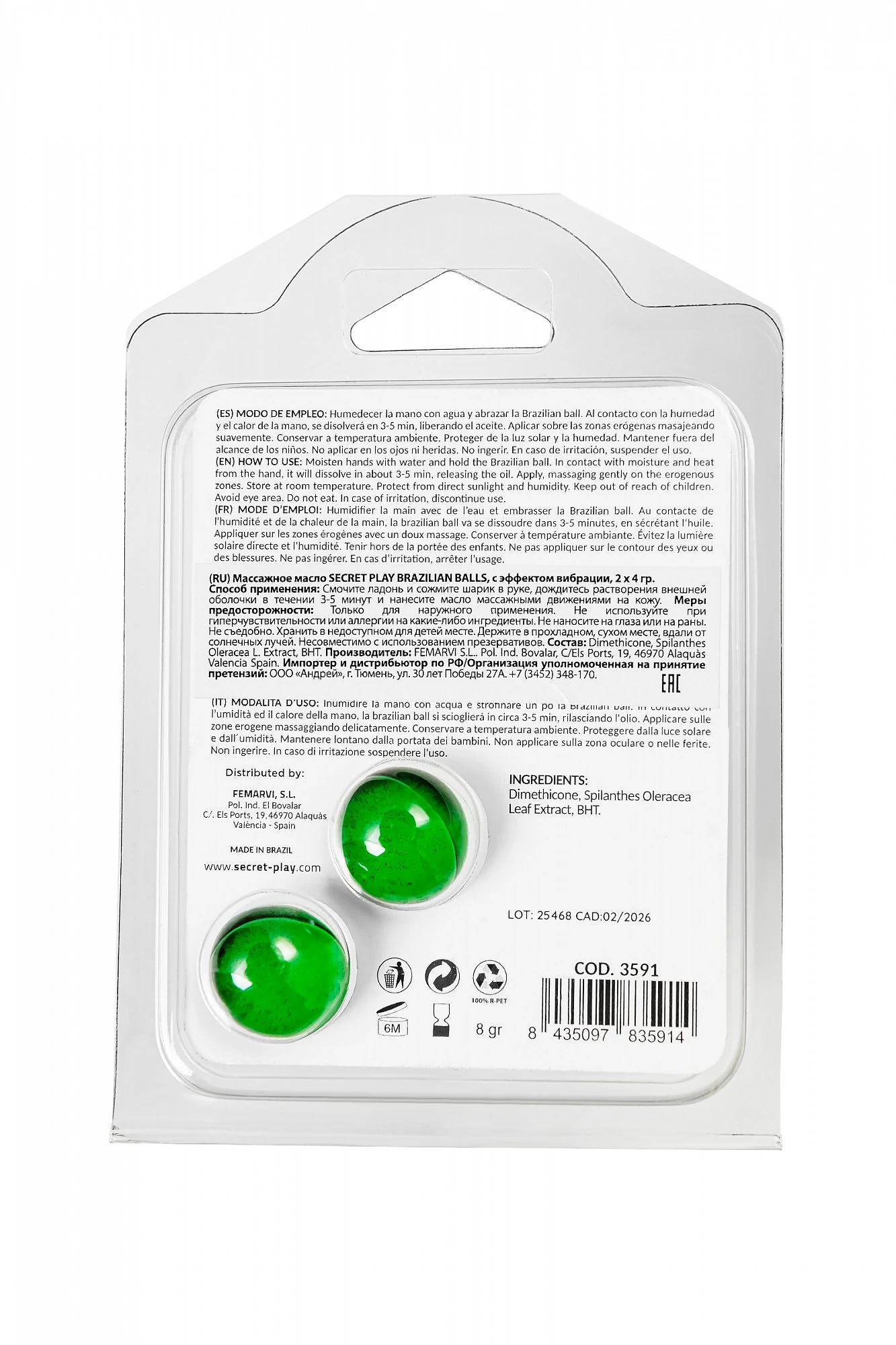 Brazilian Balls с вибрационным эффектом это уникальные массажные шарики от Secret Play, которые добавят неожиданные и захватывающие ощущения в ваши интимные моменты. Эти бразильские шарики обладают инновационным эффектом вибрации, который создает легкое покалывание и усиливает чувственность ваших прикосновений. Они мгновенно привносят игривость и нежность в прелюдию, превращая её в захватывающее приключение. Чтобы ощутить всю магию Brazilian Balls с вибрацией, просто смочите руку водой, обнимите шарик ладонью и подождите несколько минут. Тепло и влажность рук позволят шарикам раствориться, высвобождая нежное масло с легким эффектом вибрации. Это создает особые ощущения покалывания, усиливая возбуждение и делая ваши ласки еще более запоминающимися. Идеально для тех, кто хочет добавить немного неожиданных ощущений в интимную игру! Позвольте Brazilian Balls с вибрационным эффектом от Secret Play добавить немного неожиданного удовольствия в ваши романтические моменты. В комплекте: 2 бразильских шарика по 4 грамма