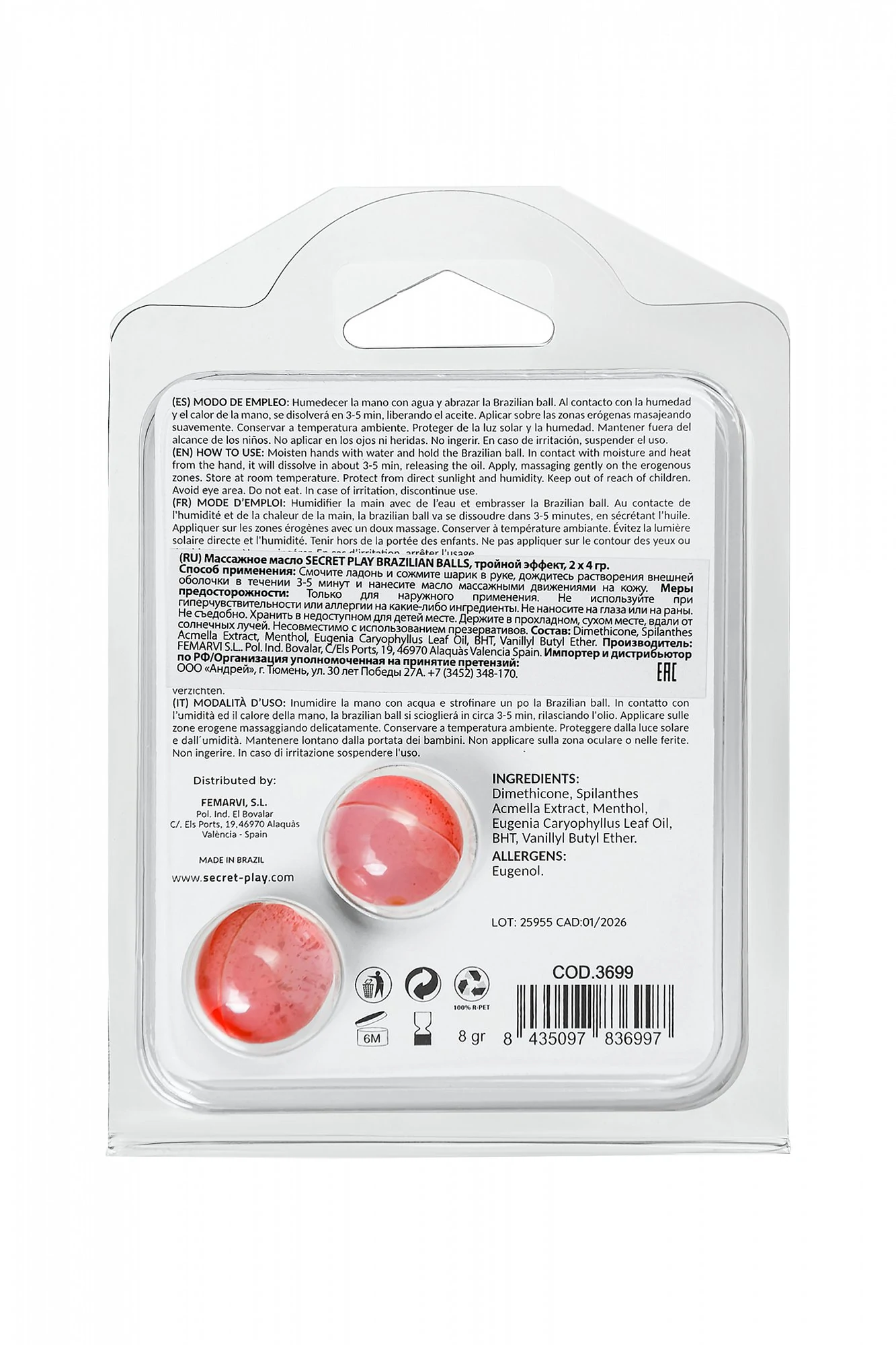 Бразильские шарики с тройным эффектом это уникальное удовольствие, объединяющее сразу три воздействия в одном продукте. Эти шарики созданы для тех, кто ищет новые ощущения и хочет сделать свои чувственные моменты более насыщенными и разнообразными. Попробуйте контрастную игру температур, добавьте нотку пряности и ощутите легкую вибрацию, чтобы сделать прелюдию и эротические игры ещё более захватывающими. Чтобы воспользоваться всеми их преимуществами, просто смочите руку водой и обнимите ладонью шарик. Тепло и влажность активируют его, и через 3–5 минут он растворится, высвобождая массажное масло. Этот тройной эффект — холод, тепло с пряной ноткой и вибрация — стимулирует ваши чувства, создавая ощущения, которые невозможно забыть. Испытайте мощное сочетание трех эффектов и откройте для себя новое измерение удовольствия с бразильскими шариками! Тройное воздействие: холодный, горячий пряный и эффект с вибрацией для усиления ощущений. 2 бразильских шарика по 4 грамма каждый.
