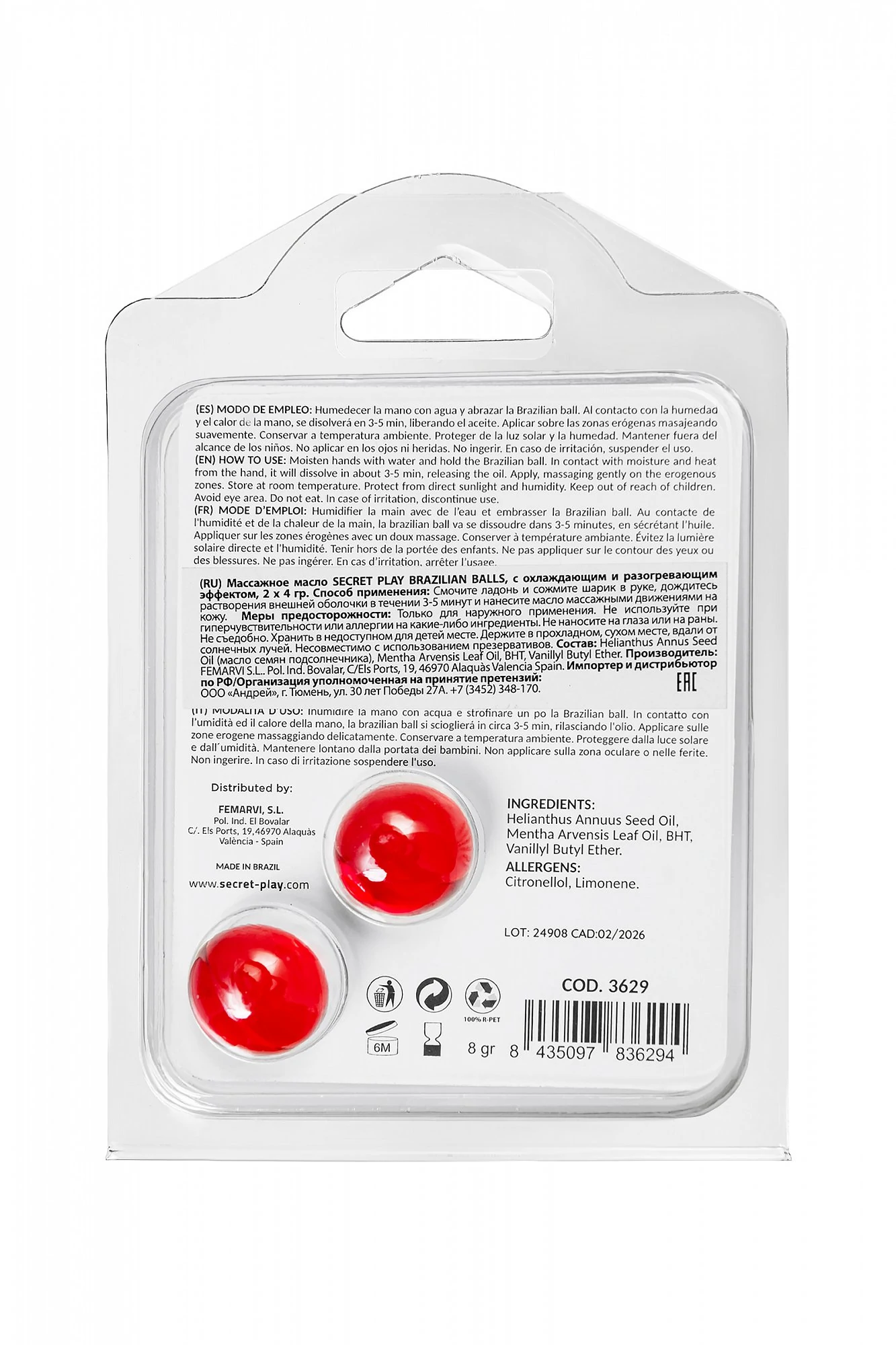 Бразильские шарики с горячим и холодным эффектом это уникальное сочетание, которое подарит незабываемые ощущения контрастной игры температур. Эти шарики от Secret Play разработаны для тех, кто хочет испытать страстное сочетание тепла и прохлады, усиливающее чувственные моменты и добавляющее разнообразие в прелюдию. Дайте волю своим желаниям и откройте для себя новую палитру удовольствий. Просто смочите руку водой и обнимите ладонью шарик, чтобы начать его таяние. Через 3–5 минут он растворится, выпуская массажное масло, которое дарит одновременно согревающее и освежающее ощущение. Эффект сочетания тепла и прохлады делает каждое прикосновение более острым, возбуждающим и незабываемым. Подарите себе и своему партнёру контрастное наслаждение с бразильскими шариками, которые разжигают страсть и дарят моменты неповторимого удовольствия! Горячий и холодный эффект создает контрастные ощущения, усиливающие чувственные удовольствия. 2 бразильских шарика по 4 грамма каждый.