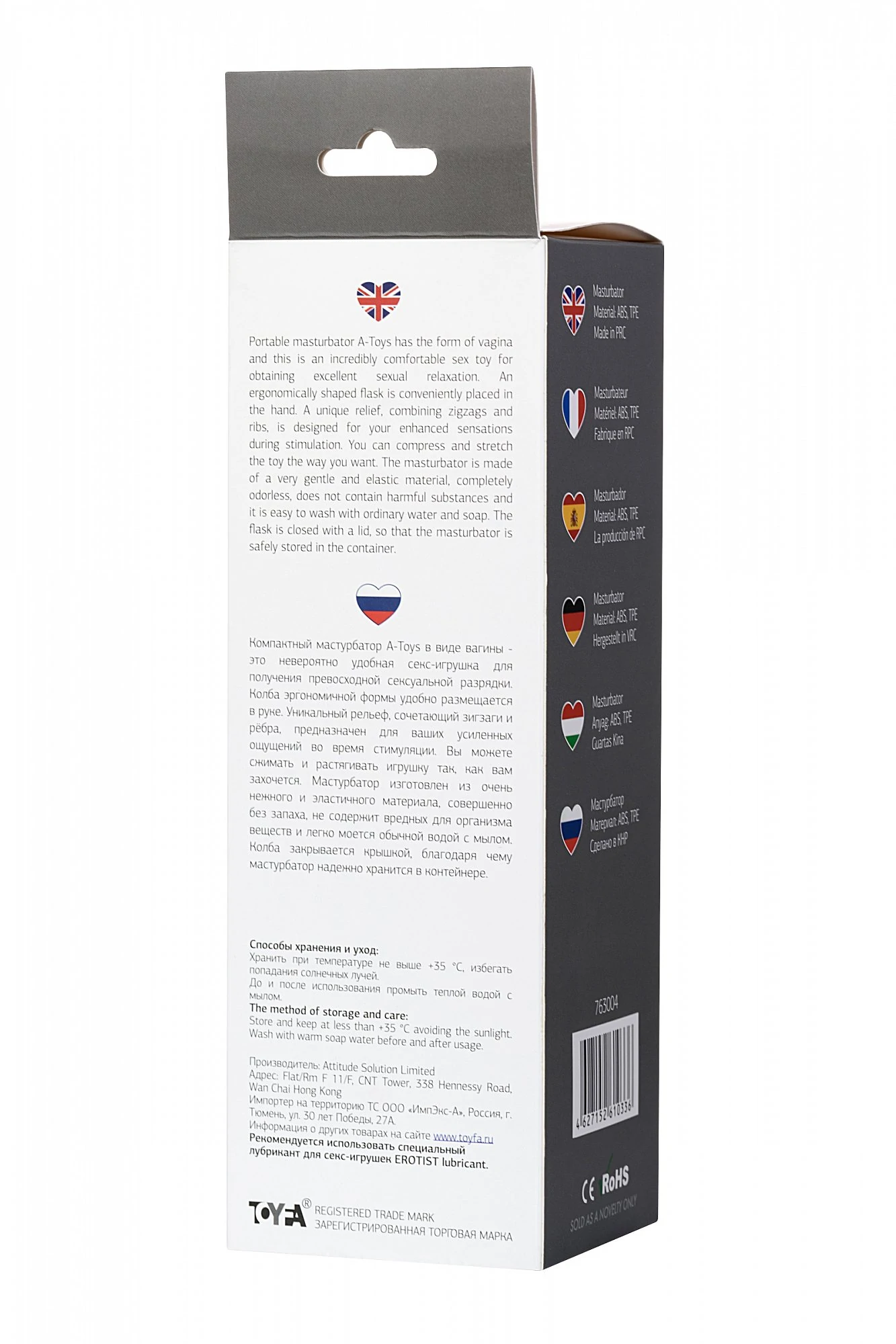 Компактный мастурбатор A-Toys в виде вагины, это невероятно удобная секс-игрушка для получения превосходной сексуальной разрядки. Колба эргономичной формы удобно размещается в руке. Уникальный рельеф, сочетающий зигзаги и рёбра, предназначен для ваших усиленных ощущений во время стимуляции. Вы можете сжимать и растягивать игрушку так, как вам захочется. Мастурбатор изготовлен из очень нежного и эластичного материала, совершенно без запаха, не содержит вредных для органима веществ и легко моется обычной водой с мылом. Колба закрывается крышкой, благодаря чему мастурбатор надежно хранится в контейнере.