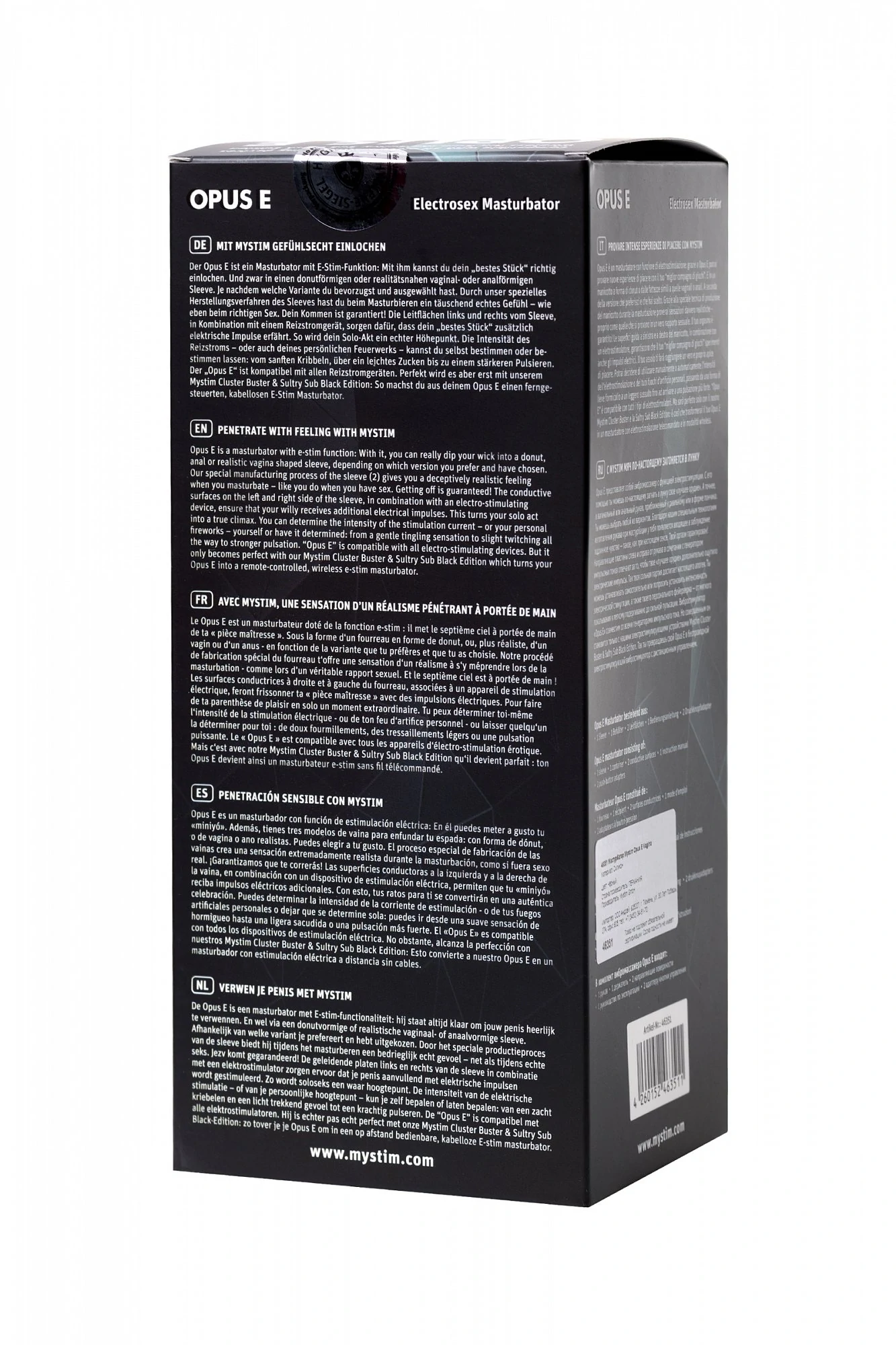 Mystim Opus E Vagina — мастурбатор нового поколения. В его арсенале, помимо впечатляющего рельефа для мощного эротического массажа, есть электростимулятор, который выводит наслаждение на уровень выше. Мастурбатор плотно обхватывает член, а внутренний рельеф очень деликатно активно его массирует. На деле это ощущается как головокружительная мастурбация руками опытной массажистки. Форма соблазнительных «губок» задает процессу игривое настроение, а нежный материал имитирует реальный секс. Mystim Cluster Buster или Sultry Sub Black превращают мастурбатор в электростимулятор, благодаря которому сексуальные эксперименты становятся фейерверком оргазмов. Дразнящие покалывания или ощутимые импульсы — электростимулятор будет баловать тем сценарием, который вы выберете. Стильный корпус удобно лежит в руке и позволяет не отвлекаться от игры. Девайс довольно аскетичен в уходе — ему достаточно мыла и теплой воды или дезинфектора. Мастурбатор Mystim Opus E Vagina — для достойных большего.
