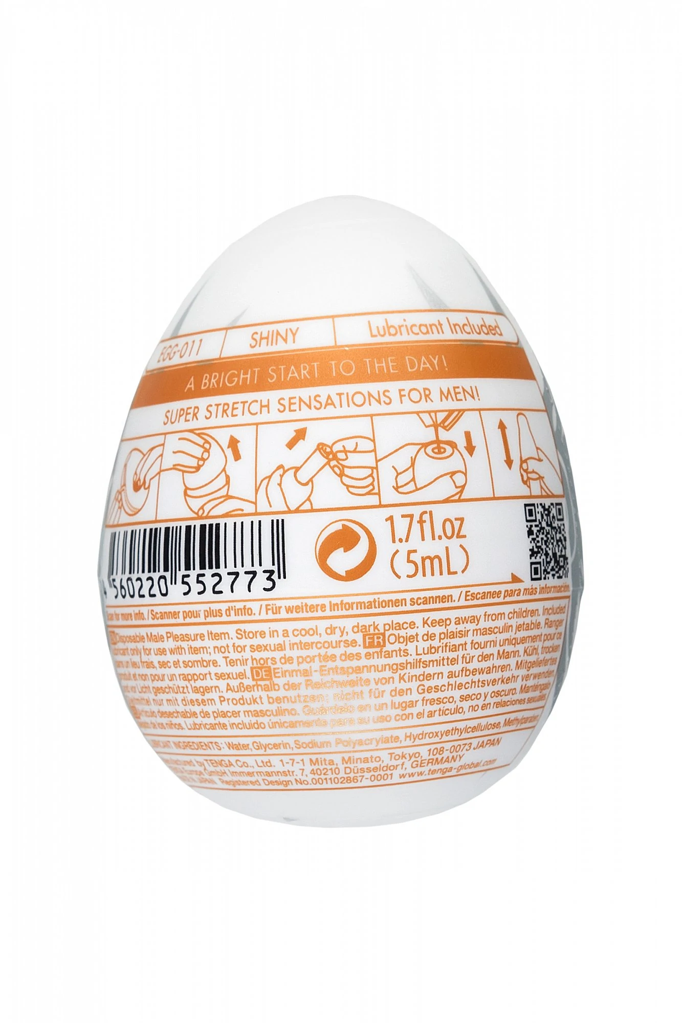 Сделать любое утро солнечным и радостным с Tenga Egg Shiny - проще простого! Доставьте себе феноменальные, ни с чем несравнимые, ощущения с Tenga Egg! Это яичко с секретом. Снимите пленку с помощью отрывного лепестка и откройте яйцо. Внутри вы найдете упаковку с лубрикантом и супермягкую, сверхэластичную секс-игрушку. Нанесите лубрикант внутрь силиконового яичка. Оденьте и наслаждайтесь! Эти яички прекрасно растягиваются в длину и принимают форму любого пениса. Совершайте рукой знакомые движения, получая дополнительное фантастическое удовольствие! Двойное кольцо на входе обеспечивает приятное проникновение и тесное облегание. Натяжение и внутренняя фактура позволяют Tenga Egg ласкать одновременно ствол и головку, а потом довести вас до самого глубокого и насыщенного оргазма. Tenga Egg также предлагает восхительный бонус. Яичко можно вывернуть, одеть на ладонь и ласкать любые чувственные зоны мягким, нежным рельефом.