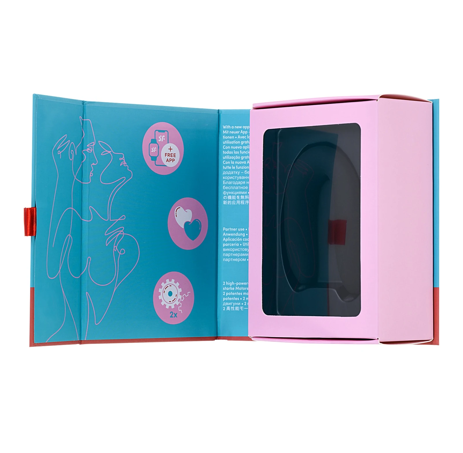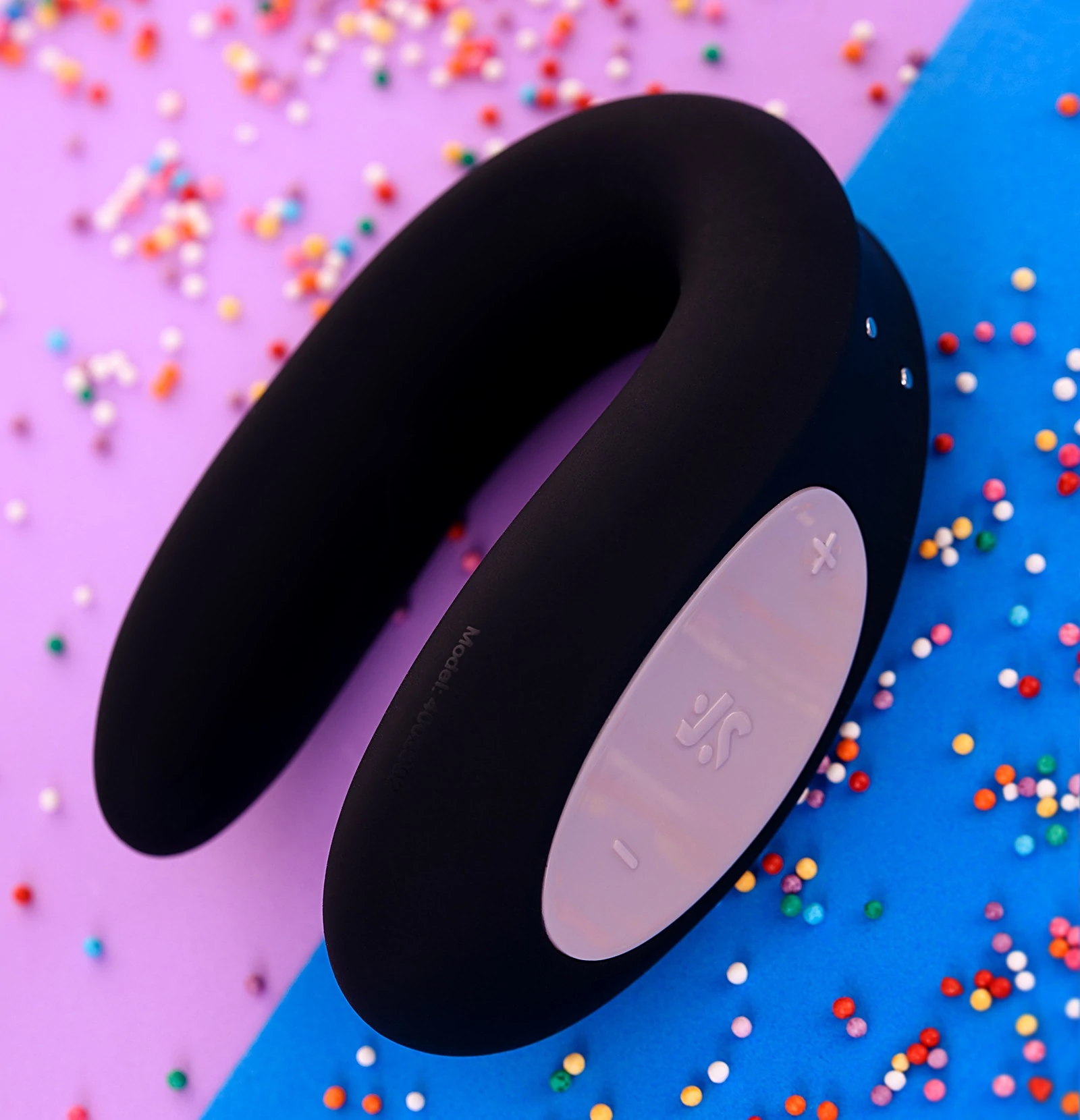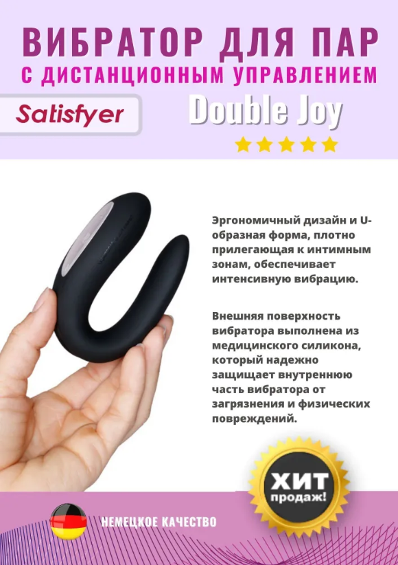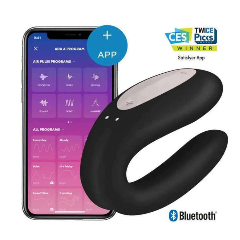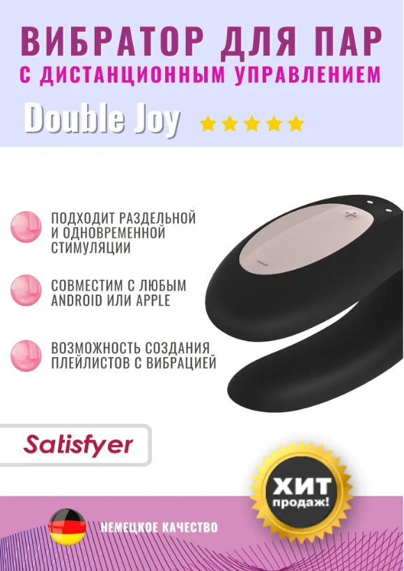 Благодаря эргономичному дизайну Satisfyer Double Joy имеет U-образную форму, плотно прилегающую к интимным зонам и обеспечивающую интенсивную вибрацию. Он имеет два мотора, один из которых предназначен для стимуляции влагалища, второй для стимуляции клитора. Особенность игрушки состоит в том, что она управляется не только с помощью кнопок на корпусе, но и с помощью телефона. Новое приложение Satisfyer Connect предлагает вам уникальные возможности. Оно совместимо с любым Android или Apple, смартфоном, планшетом и Apple Watch. Приложение Satisfyer Connect не собирает никаких данных об использовании игрушки или поведении пользователей. Дистанционное управление позволит наслаждаться не только стандартными программами, но и эксклюзивными функциями по созданию своих режимов вибрации. Дополнительно в приложении есть опция, при использовании микрофона мобильного телефона можно делать преобразование окружающих звуков в вибрацию. Игрушка также вибрирует под музыку. В приложении доступна функция видео чат.