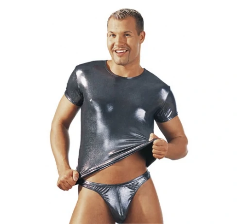 Сексуальный вид для него! Вы обязательно захотите снять эту прекрасно облигающую тело футболку. Цвет серебряный металлик. Без плавок. Материал 92% полиэстер, 8% эластан. Размер: М.