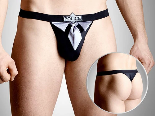 Мужские стринги черные c галстуком и надписью на резинке Police. Размер: S/L.