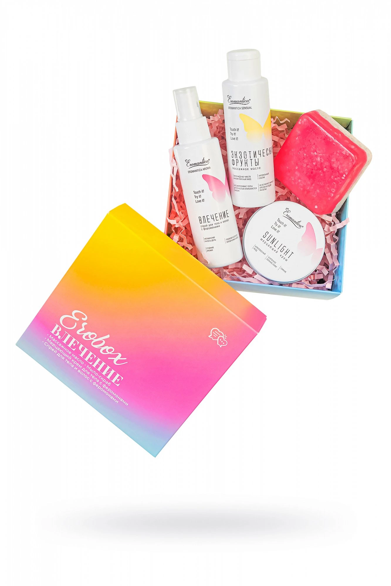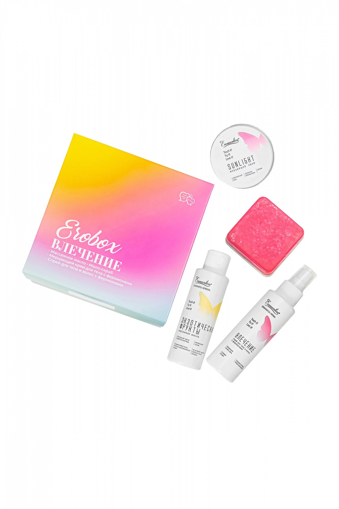 Истинное влечение начинается с любви к себе! Позволь себе роскошный уход за телом в готовом ЭРОбоксе Влечение от Eromantica. Двойная основа мыла-скраба Дайкири содержит в составе морскую соль и мелкие частицы абрикосовых косточек, которые подарят коже бережное отшелушивание, деликатный массаж и антицеллюлитный эффект. После скрабирования нанеси на тело натуральное массажное масло Экзотические фрукты с ароматами манго и орхидеи, насладись его заботой о коже и ее интенсивным питанием. Придай королевского сияния с мерцающим кремом Поцелуй солнца. Золотые частички мики создадут притягивающий восхищенные взгляды эффект свечения на коже лица и тела, натуральные масла глубоко увлажнят и напитают кожу, а феромоны ненавязчиво намекнут противоположному полу о твоей сексуальности и чувственности. Эффект соблазнения усилит спрей для тела и волос с феромонами Влечение.