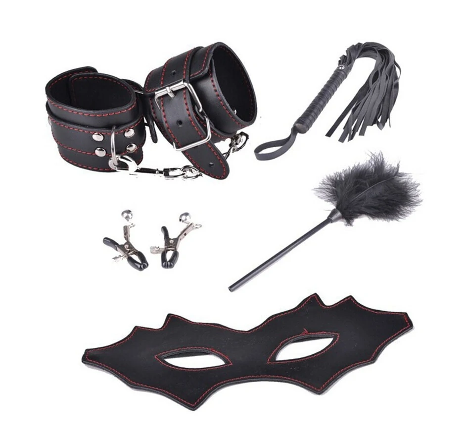 Набор БДСМ в черном цвете состоит из 5 предметов: оковы, маска, плеть, зажимы для сосков, щекоталка. Цвет: черный. Материал: искусственная кожа.