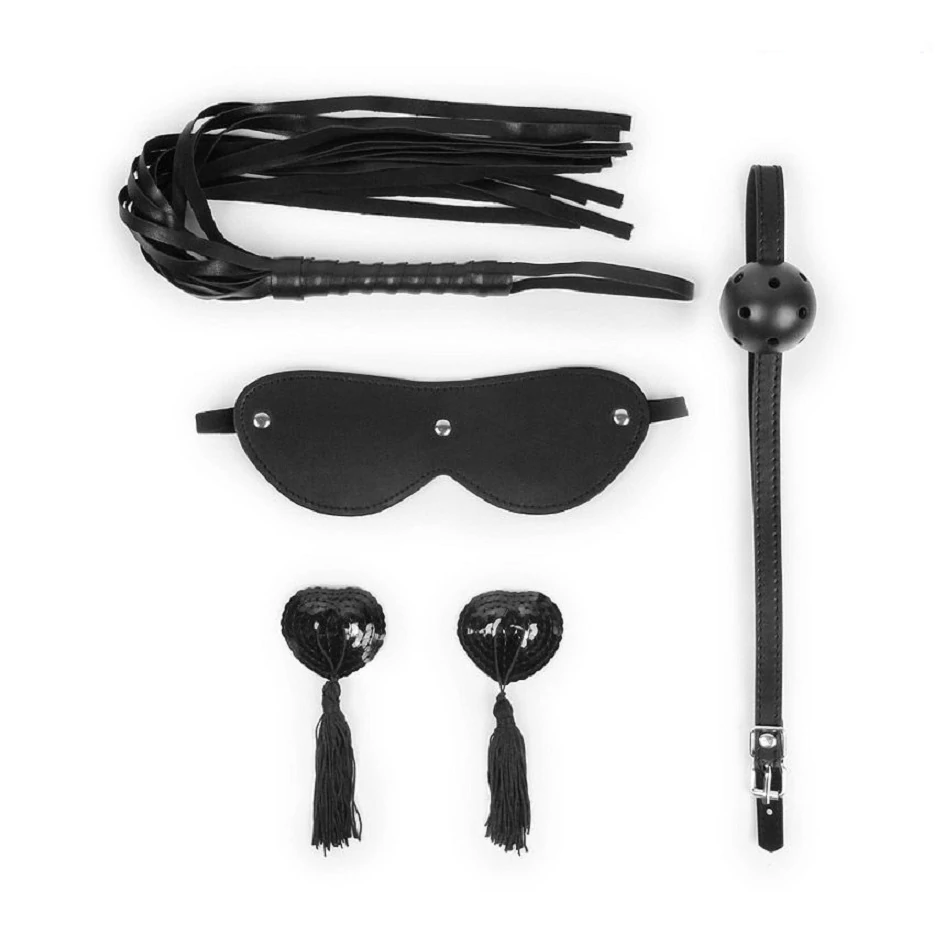 Великолепный набор аксессуаров для любителей БДСМ-игр. В комплект входят плеть, кляп, маска и пэстисы для украшения сосков.