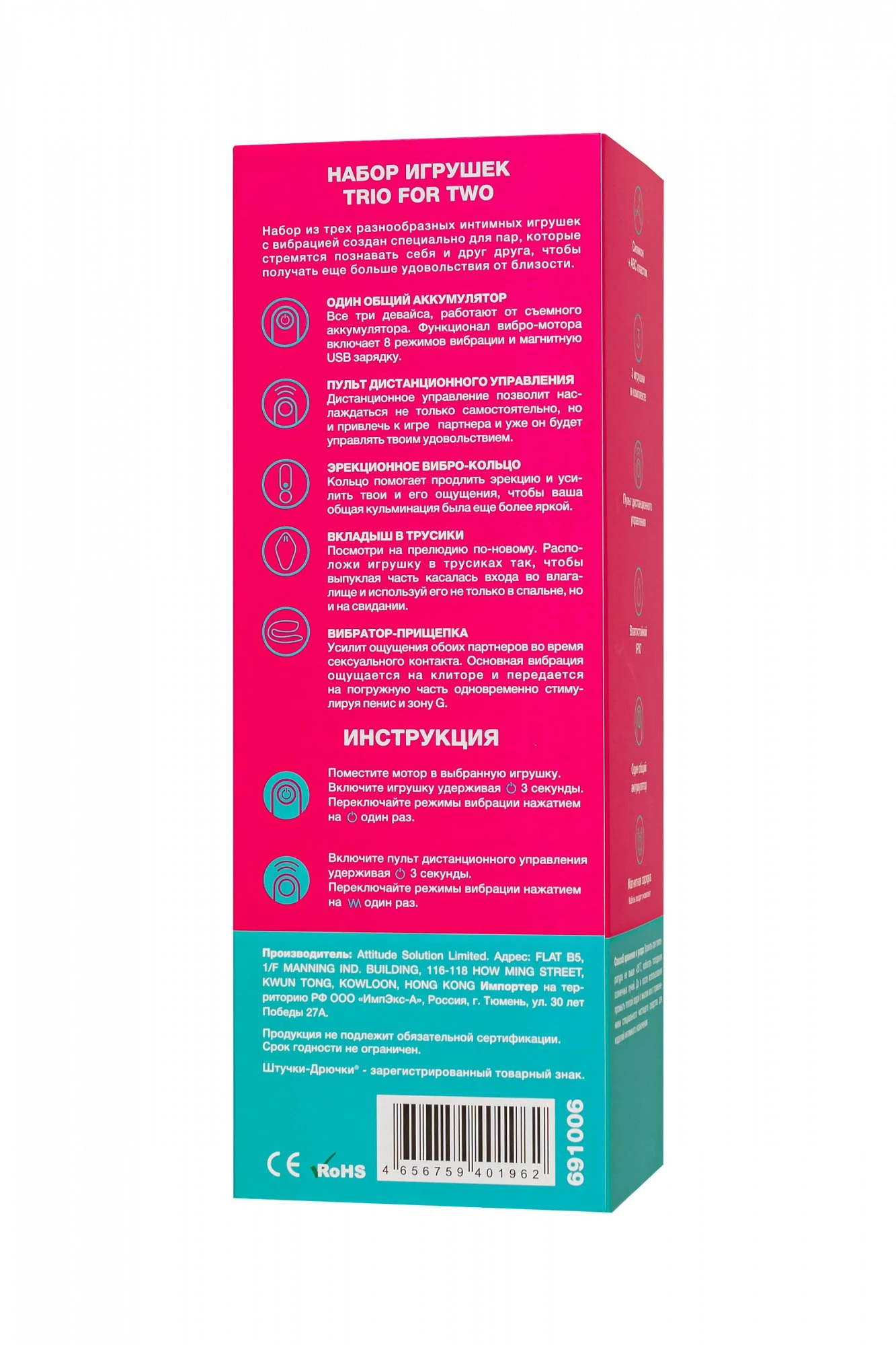 Мир меняется и вместе с ним пробуждается желание узнавать свое тело лучше и глубже. Набор из трех разнообразных интимных игрушек с вибрацией создан специально для пар, которые стремятся познавать себя и друг друга, чтобы получать еще больше удовольствия от близости. Эрекционное кольцо, вкладыш в трусики и вибратор-прищепка для одновременной стимуляции. Все три девайса, работают от съемного аккумулятора-вибратора и управляются с помощью пульта. Функционал вибромотора включает 8 режимов вибрации и магнитную USB зарядку. Игрушки выполнены из качественного шелковистого силикона насыщенного изумрудно-зеленого цвета. Для комфортного использования рекомендуется использовать с лубрикантом на водной основе. Для более комфортного использования рекомендуем приобрести смазку на водной основе и очищающий спрей Clear Toy 100 мл для обработки изделия.