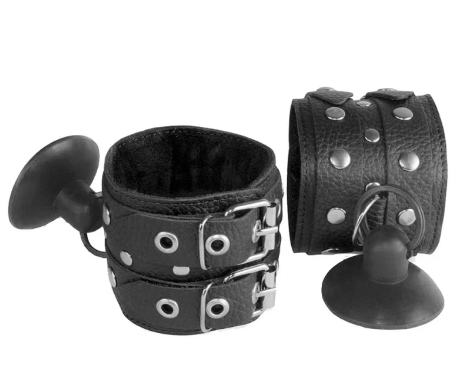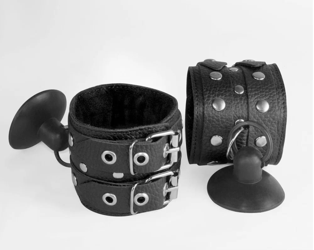 Наручники с присоской. Изготавливаются из натуральной кожи с велюровой подкладой. При изготовлении использована фурнитура с никелевым покрытием. Между слоем основы и подкладой проложена мягкая прокладка. Не нарушают кровообращение, надёжно фиксируются на запястьях с помощью двух ремешков. Размер универсальный. Цвет: черный.