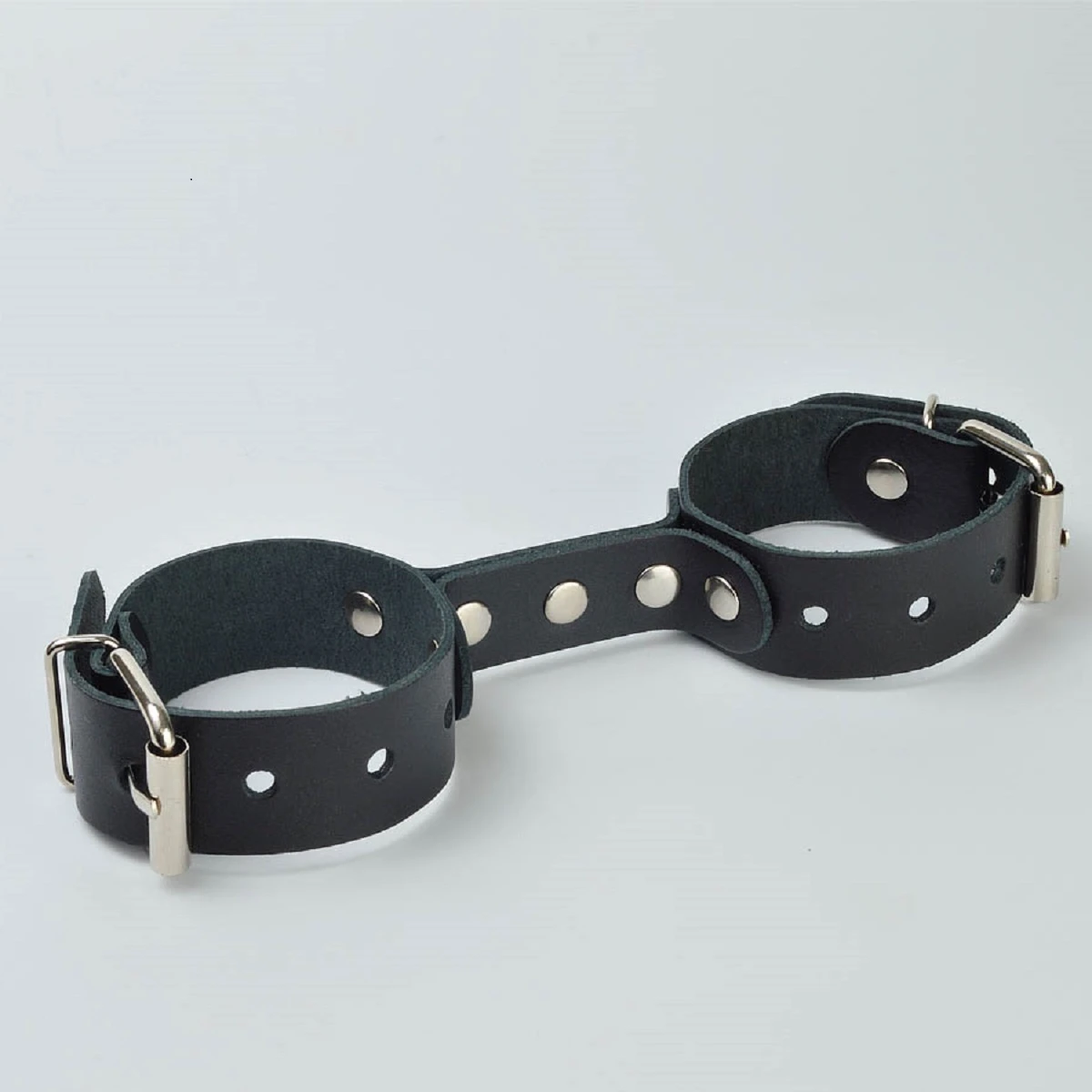 Наручники изготовлены из ременной кожи. Фурнитура никелированная. Максимальный окружность наручников 24 см. Ширина ремешков 2,5 см. Наручники имеют кожаную перемычку, на которой зафиксированы наручники. Цвет черный.