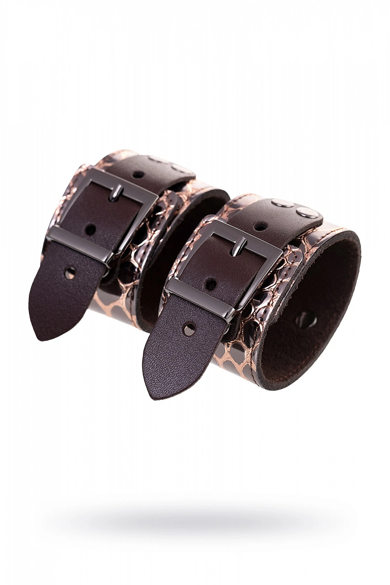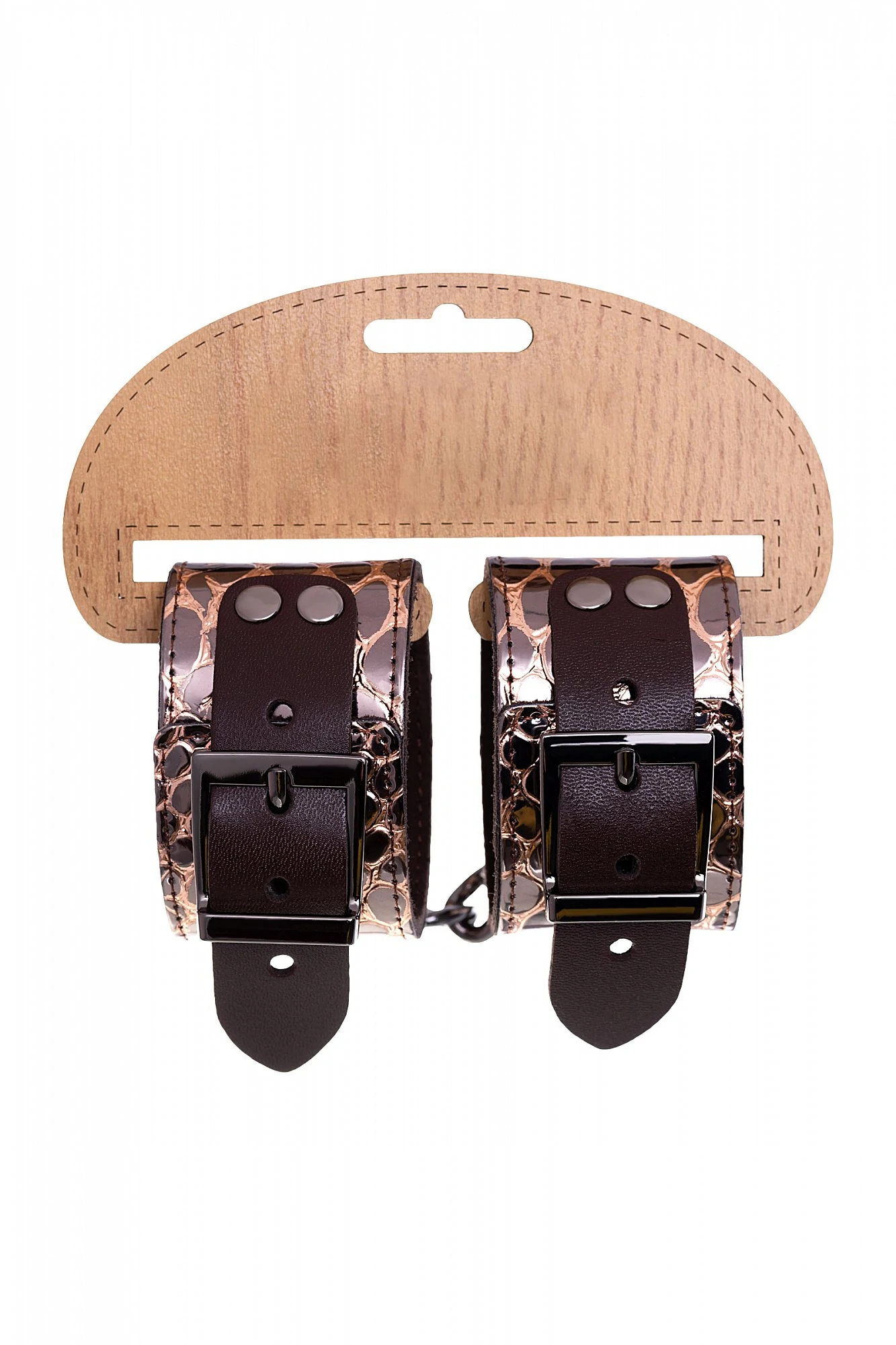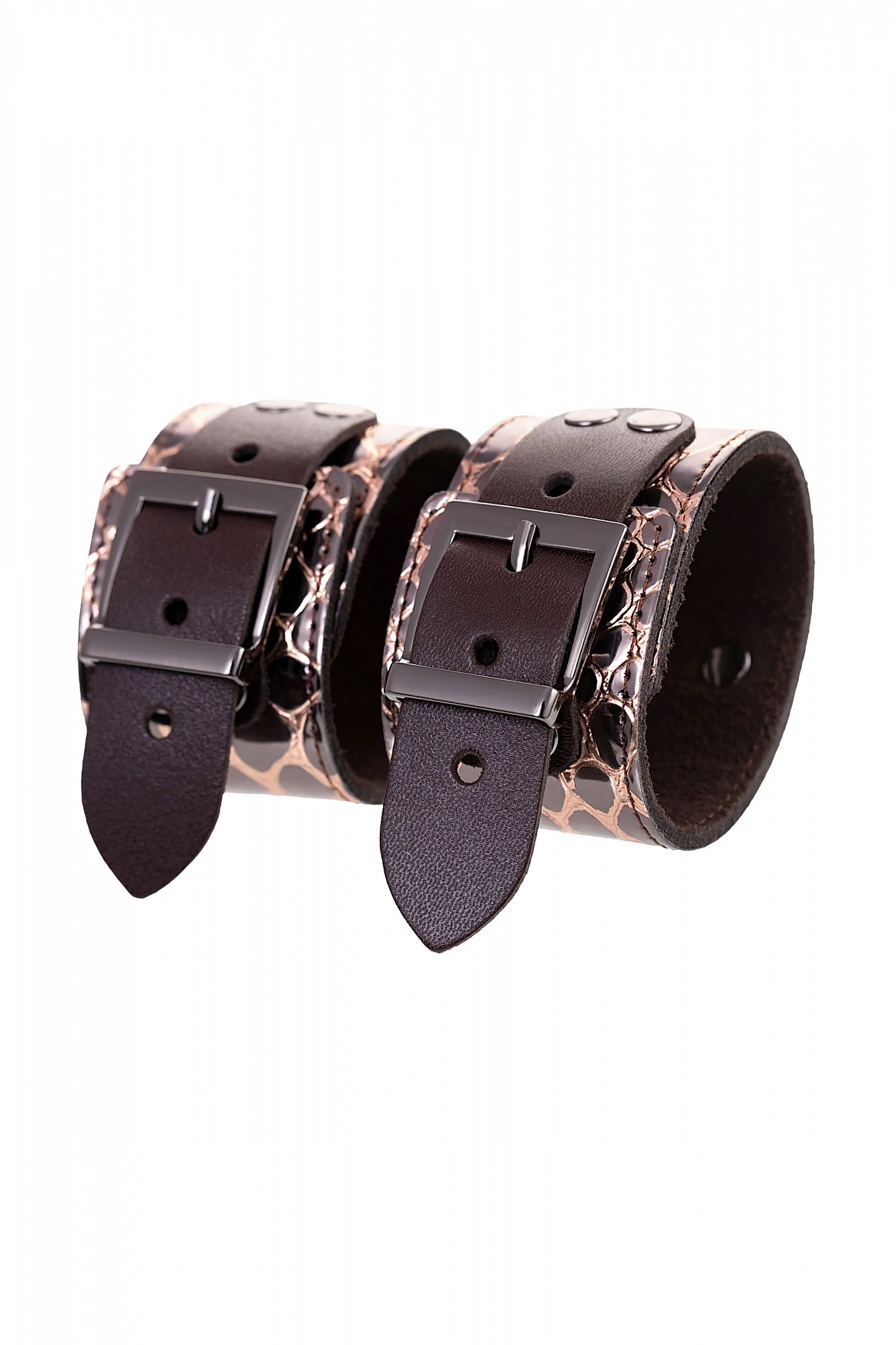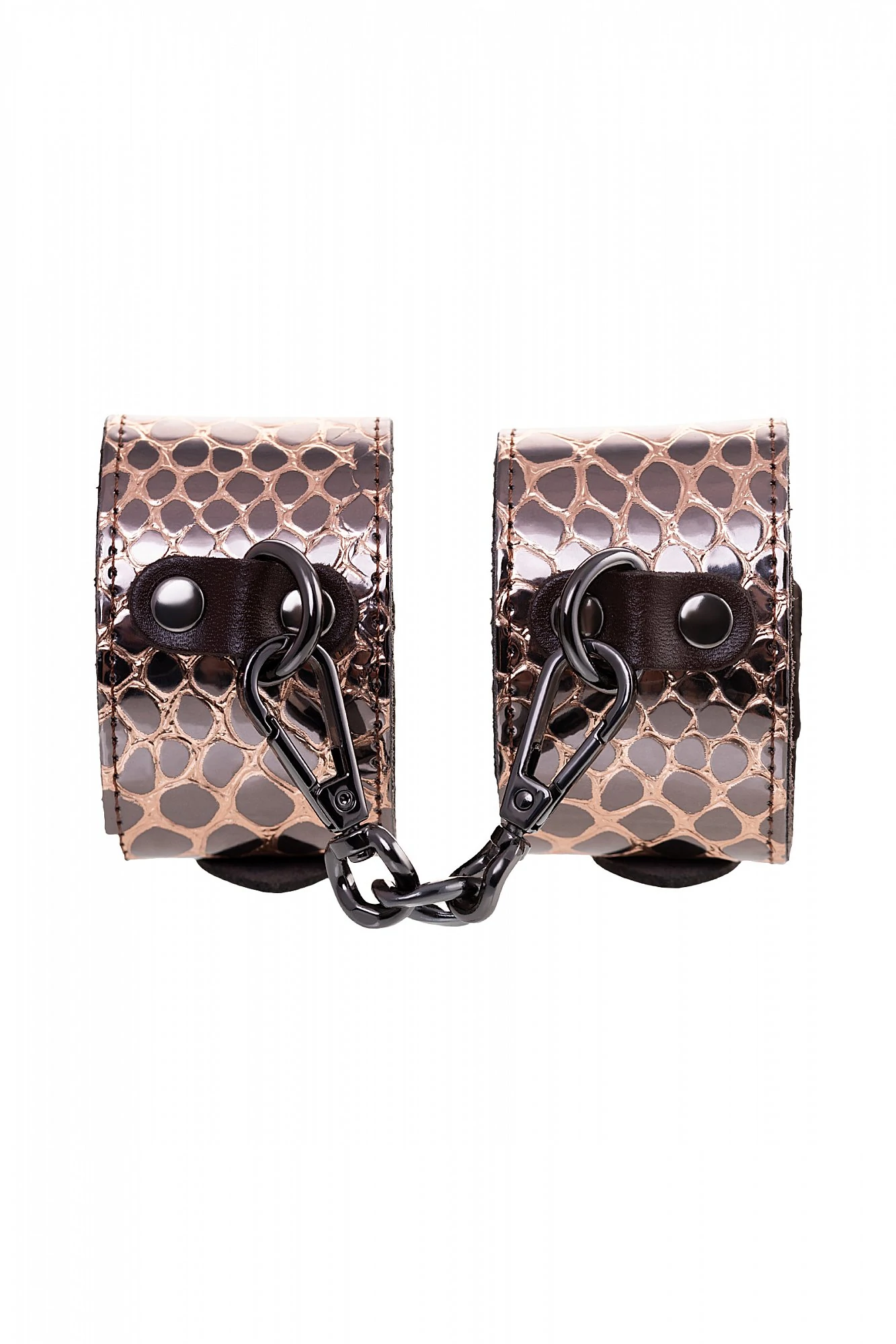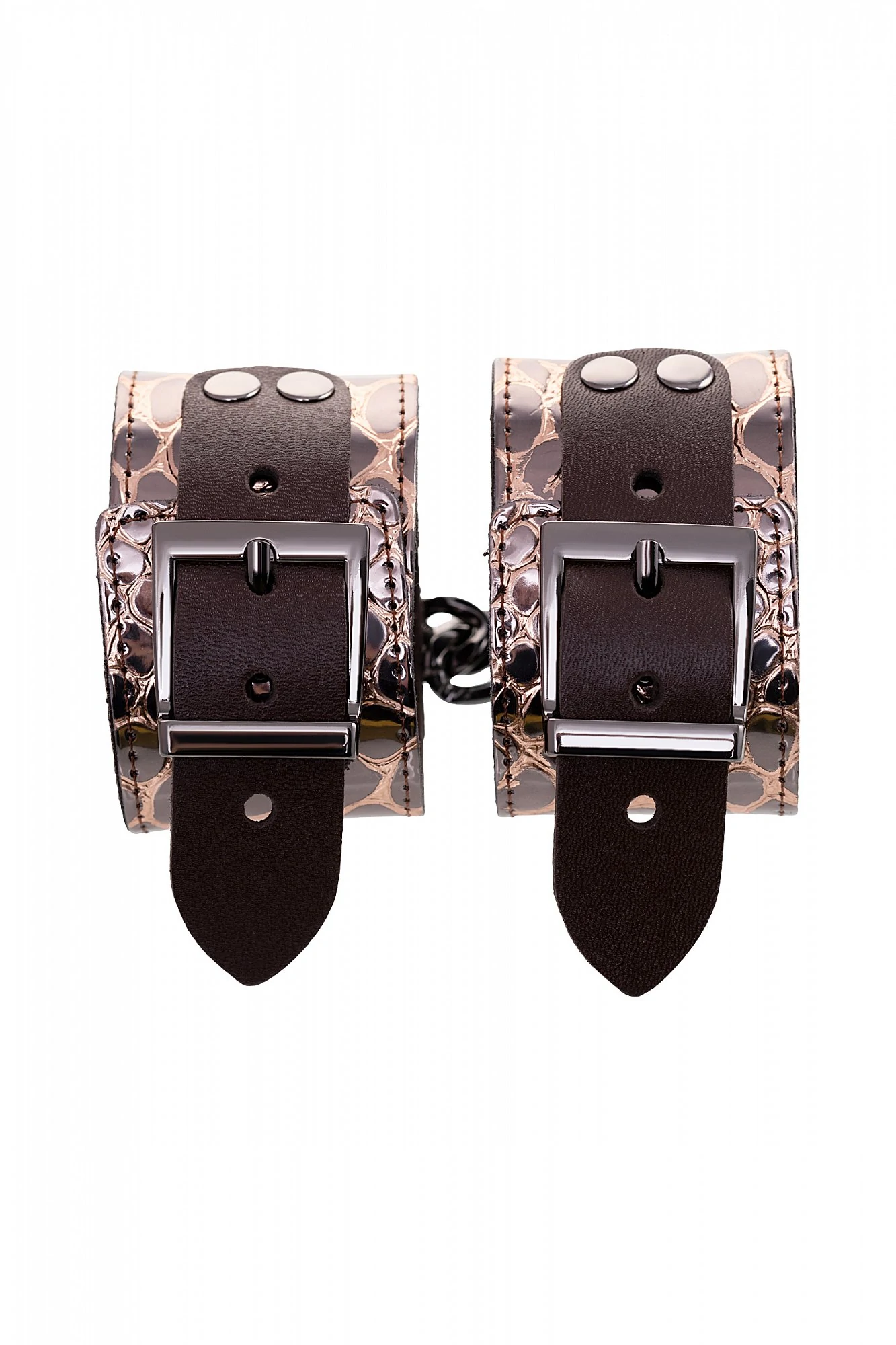 Наручники изготовлены из натуральной кожи. Регулируются при помощи металлических пряжек. Наручники соединяются карабинами. Общая длина 27 см. Ширина 4,6 см.