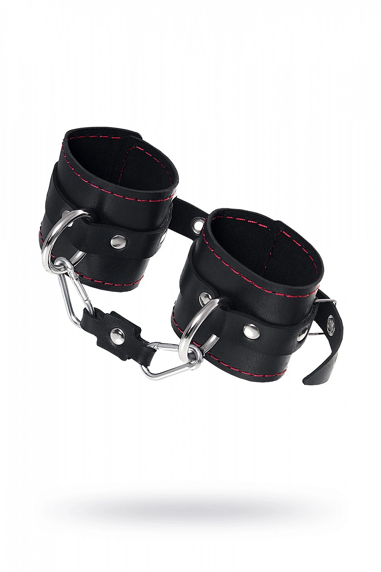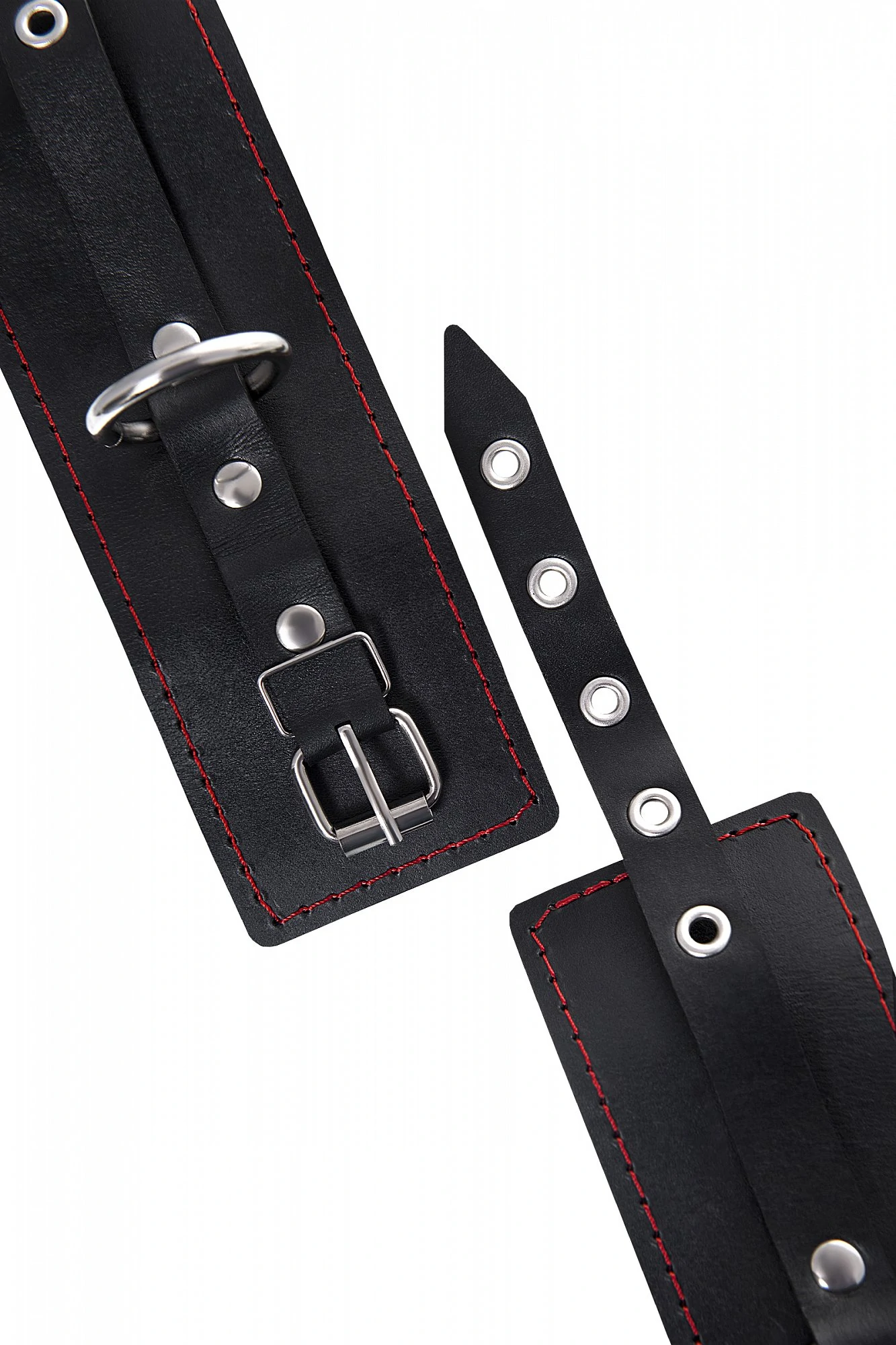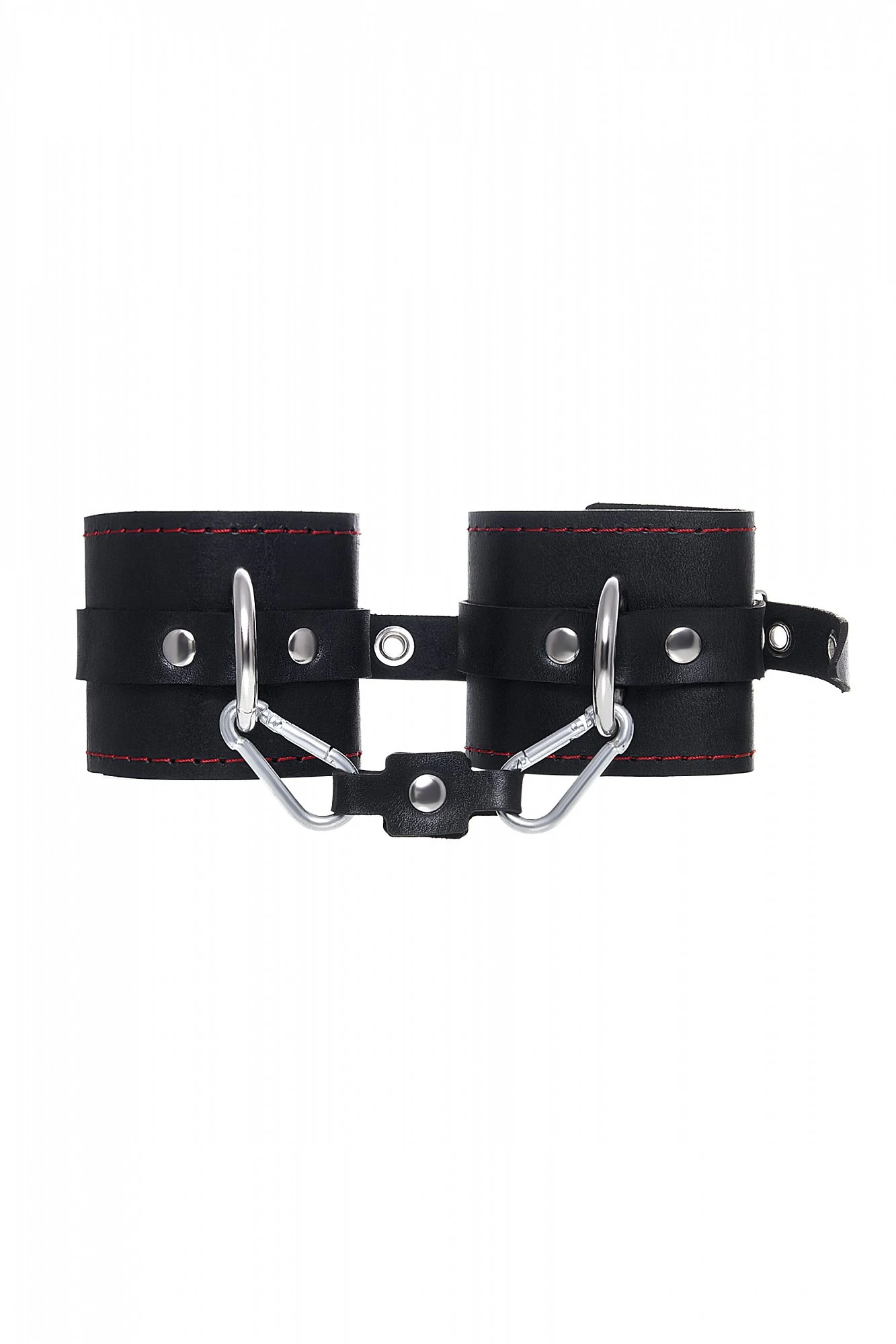 Однослойные кожаные наручники с контрастной строчкой красного цвета могут стать стильным аксессуаром на «свободных» руках, но могут послужить вашим целям и фантазиям по своему прямому назначению. Наличие двух карабинов и колец позволяет использовать изделие как раздельно – аксессуар-манжеты, так и как наручники для фиксации. К широким металлическим кольцам также можно присоединить и другие аксессуары при помощи карабинов. Благодаря универсальному размеру наручники могут использоваться и мужчинами, и женщинами. Размер легко регулируется с помощью металлических пряжек, органично вписывающихся в общий стиль. Материал: натуральная кожа. Цвет черный. Размер: ширина манжет 6,5 см, длина манжет 20 см, длина сцепки 11 см.