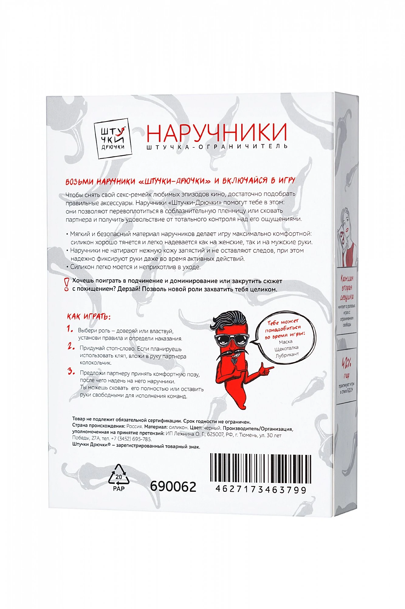Возьми наручники «Штучки-Дрючки» и включайся в игру. Чтобы снять свой секс-ремейк любимых эпизодов кино, достаточно подобрать правильные аксессуары. Наручники «Штучки-Дрючки» помогут тебе в этом: они позволяют перевоплотиться в соблазнительную пленницу или сковать партнера и получить удовольствие от тотального контроля над его ощущениями. Мягкий и безопасный материал наручников делает игру максимально комфортной: силикон хорошо тянется и легко надевается как на женские, так и на мужские руки. Наручники не натирают нежную кожу запястий и не оставляют следов, при этом надежно фиксируют руки даже во время активных действий. Силикон легко моется и неприхотлив в уходе. Хочешь поиграть в подчинение и доминирование или закрутить сюжет с похищением? Дерзай! Позволь новой роли захватить тебя целиком. Размер: длина 33 см. Цвет черный.