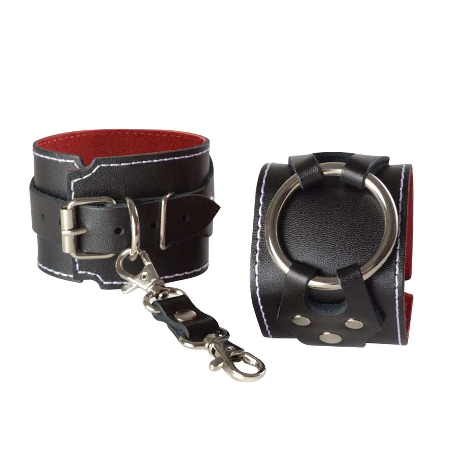 Черные наручники из натуральной кожи от Ситабелла помогут ограничить движения секс-партнёра, достаточно лишь одеть на запястья комфортный, но прочный девайс. Лаконичные, но при этом красивые наручники подойдут, как для женщин, так и для мужчин, т.к. размер легко регулируется при помощи металлической пряжки. Готические фигурные накладки, удерживающие большое металлическое кольцо, придают наручникам агрессивной сексуальности и роскоши. Соединяются наручники при помощи небольших карабинов, скреплённых кожаной перемычкой. Для комфортного использования внутренняя часть наручников выполнена из бархатистой велюровой кожи. Вся металлическая фурнитура имеет никелевое покрытие.