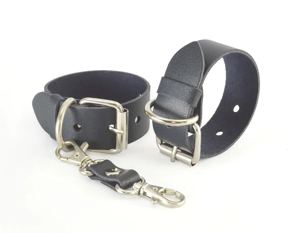 Темно-синие наручники из натуральной кожи от Ситабелла помогут ограничить движения секс-партнёра, достаточно лишь одеть на запястья комфортный, но прочный девайс. Лаконичные, но при этом красивые наручники подойдут для новичков, размер легко регулируется при помощи металлической пряжки. Соединяются наручники при помощи небольших карабинов, скреплённых кожаной перемычкой. Вся металлическая фурнитура имеет никелевое покрытие. Размер: общая длина около 23 см, ширина 2,5 см.