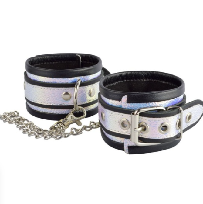Сияющие наручники от Ситабелла – это яркий и эффектный аксессуар ролевых игр, который поможет не только ограничить подвижность вашего секс-партнёра, но и своим переливающимся видом украсит запястья. Наручники изготовлены из натуральной кожи черного цвета и представляют собой основу шириной 4,8 см, поверх которой проходит ремешок выполняющий, как декоративную функцию, так и регулировочно-фиксирующую. Особенность изделию придает голографическая отделка «хамелеон». Для комфортного ношения, край наручников обработан оторочкой, что делает их округлой формы. На ремешке располагается металлическая пряжка, при помощи которой можно подогнать изделие по размеру запястья. Соединить наручники можно при помощи карабинов, скреплённых при помощи небольшой кожаной перемычки. Вся используемая металлическая фурнитура имеет никелевое покрытие.Длина наручников с ремешком около 25 см, ширина 4,8 см.