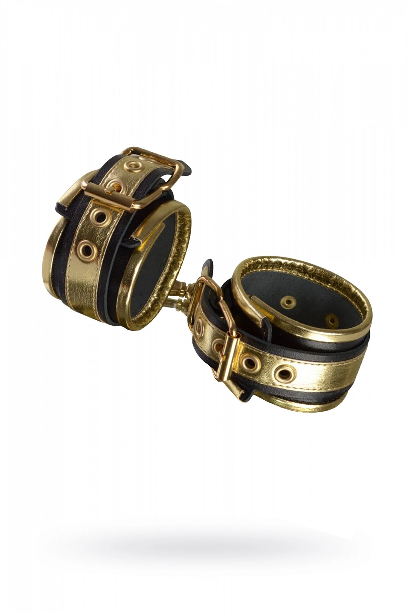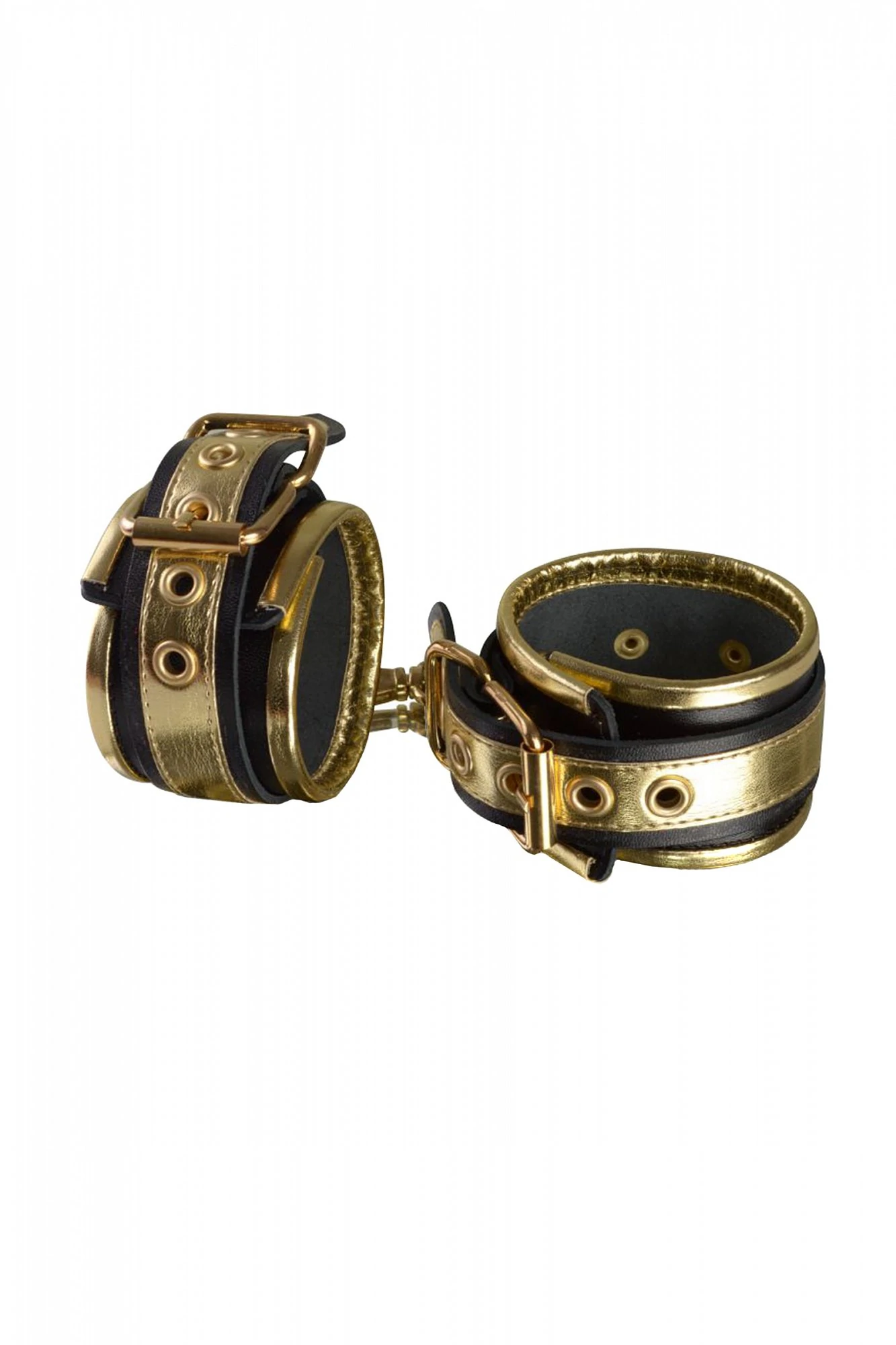 Золотистые наручники от Ситабелла – это яркий и эффектный аксессуар ролевых игр, который поможет не только ограничить подвижность вашего секс-партнёра, но и своим видом украсит запястья. Наручники изготовлены из натуральной кожи и представляет собой основу шириной 4,8 см, поверх которой проходит ремешок выполняющий, как декоративную функцию, так и регулировочно-фиксирующую. Для комфортного ношения, край наручников обработан оторочкой, что делает их округлой формы. На ремешке располагается металлическая пряжка, при помощи которой можно подогнать изделие по размеру запястья. Соединить наручники можно при помощи карабинов, скреплённых при помощи небольшой кожаной перемычки. Вся используемая металлическая фурнитура имеет никелевое покрытие. Длина наручников с ремешком около 25 см, ширина 4,8 см.
