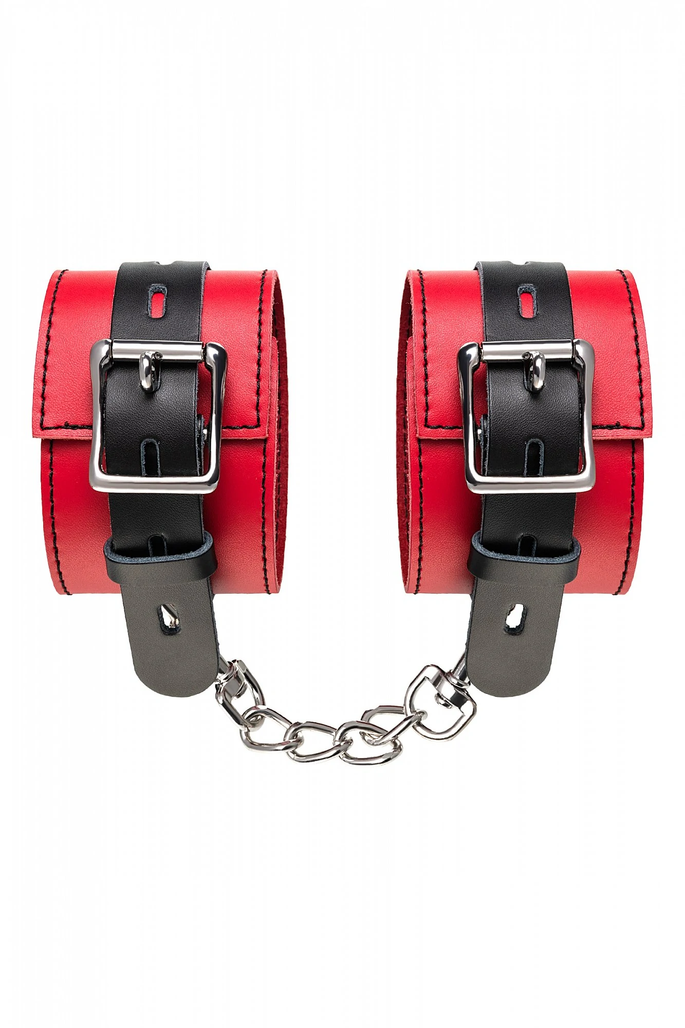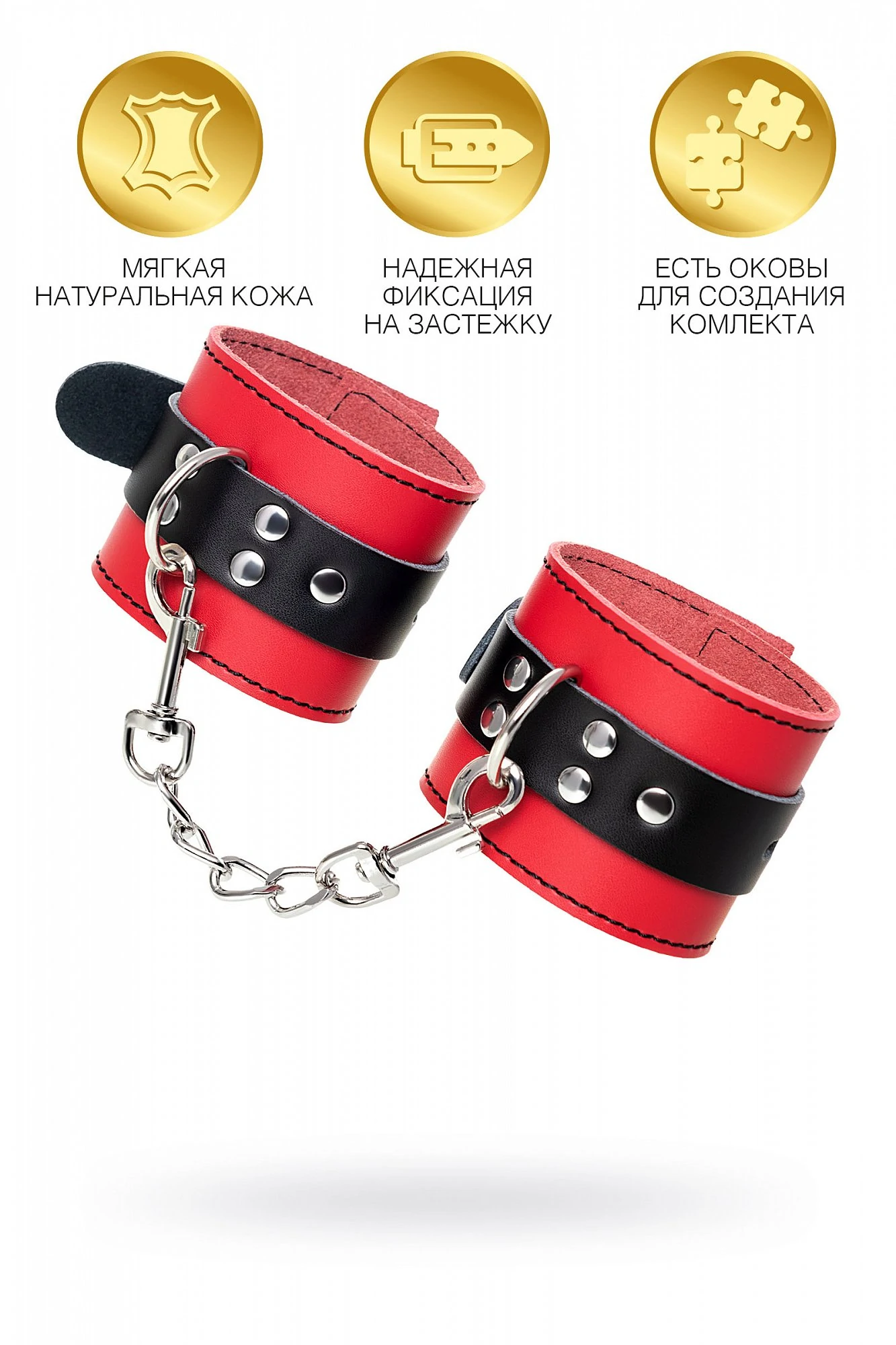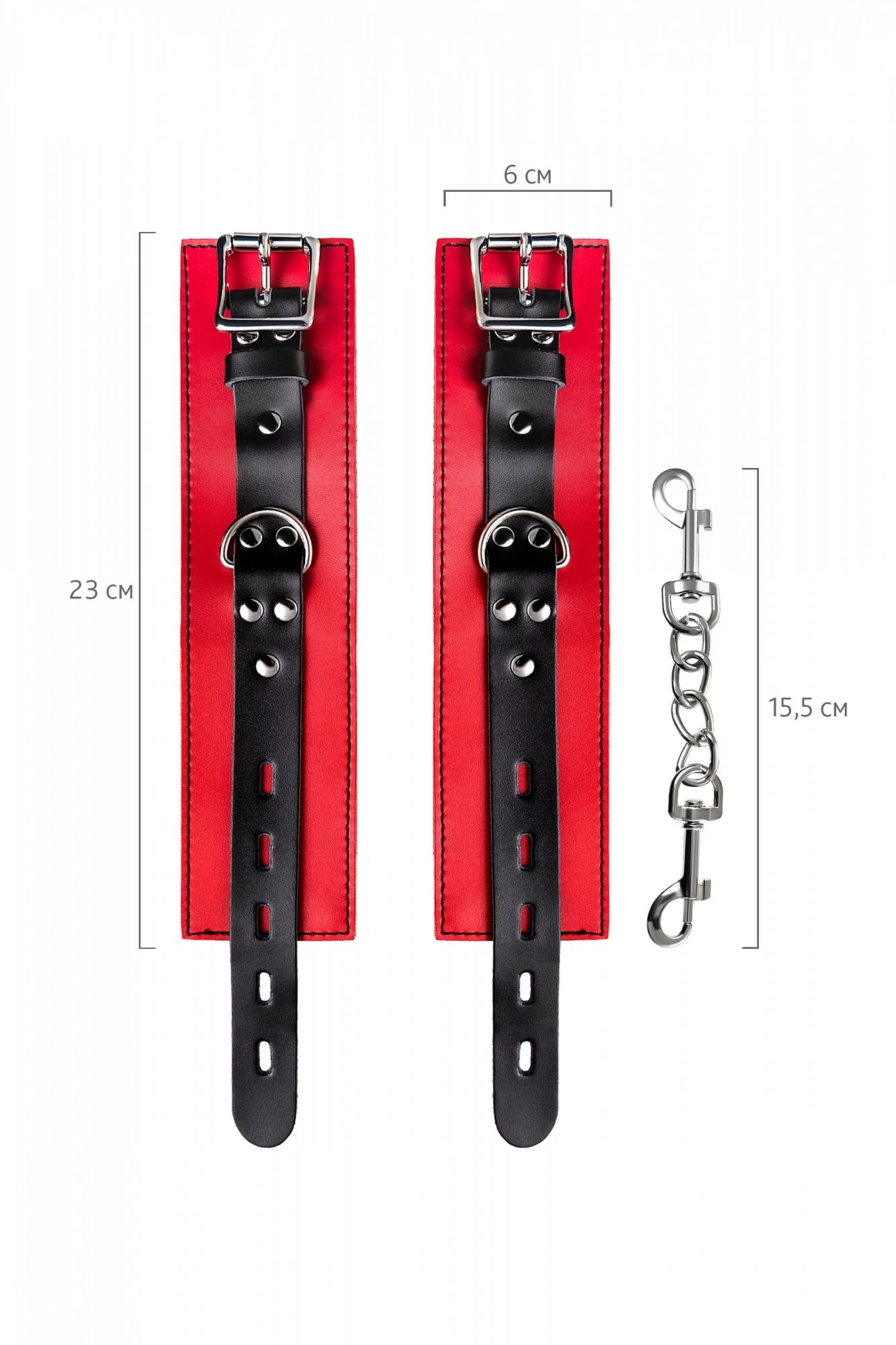 Наручники - волнующий воображение аксессуар, ведь это способ зафиксировать руки партнера и получить полный доступ к его телу. Но не забудьте про стоп-слово. Наручники из мягкой натуральной кожи сочетают в себе элементы, возбуждающие страсть и фантазию: красный и черный цвета и отделка металлическими элементами. В них будет комфортно подчиняться и ощущать ограничение свободы действий. Не натирают и имеют надежную степень фиксации. Размер легко регулируется металлической пряжкой. Эта пара - отличный вариант для начинающих в БДСМ-играх. Так почему бы не открыть для себя что-то новое? Длина наручников 23 см, ширина наручников 6 см, длина сцепки 15,5 см.