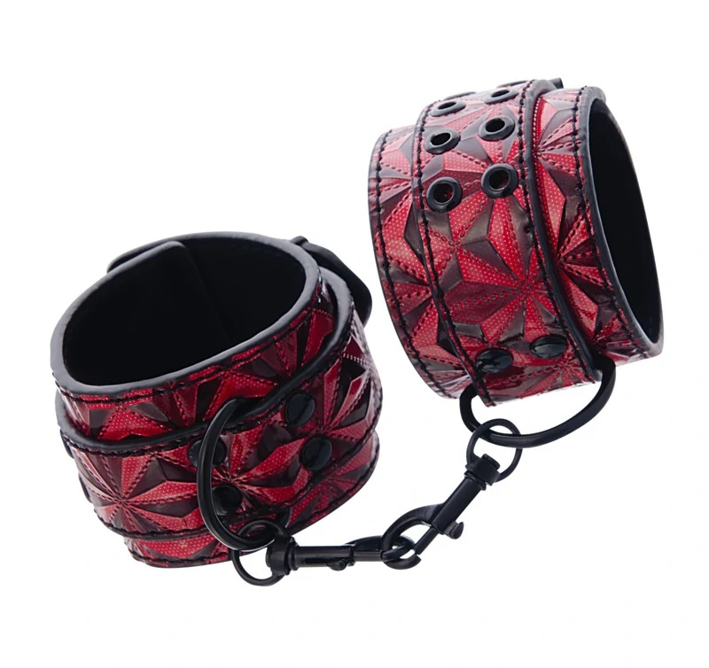 Наручники изготовлены из комбинированного материала, а именно искусственной кожи и винила, соединительная цепочка и дополнительные фиксирующие приспособления из металла. Главная сторона имеет яркую отделку узором, похожим на грани драгоценного камня, которые при поподании света переливаются, благодаря лаковому напылению. Разиер: ширина ручной манжеты 5,5 см, длина 30 см, регулировочный ремень с застежкой имеет ширину 2,5 см и длину около 36,5 см. Длина цепочки между манжетами, включая карабин 16 см. Цвет красный.