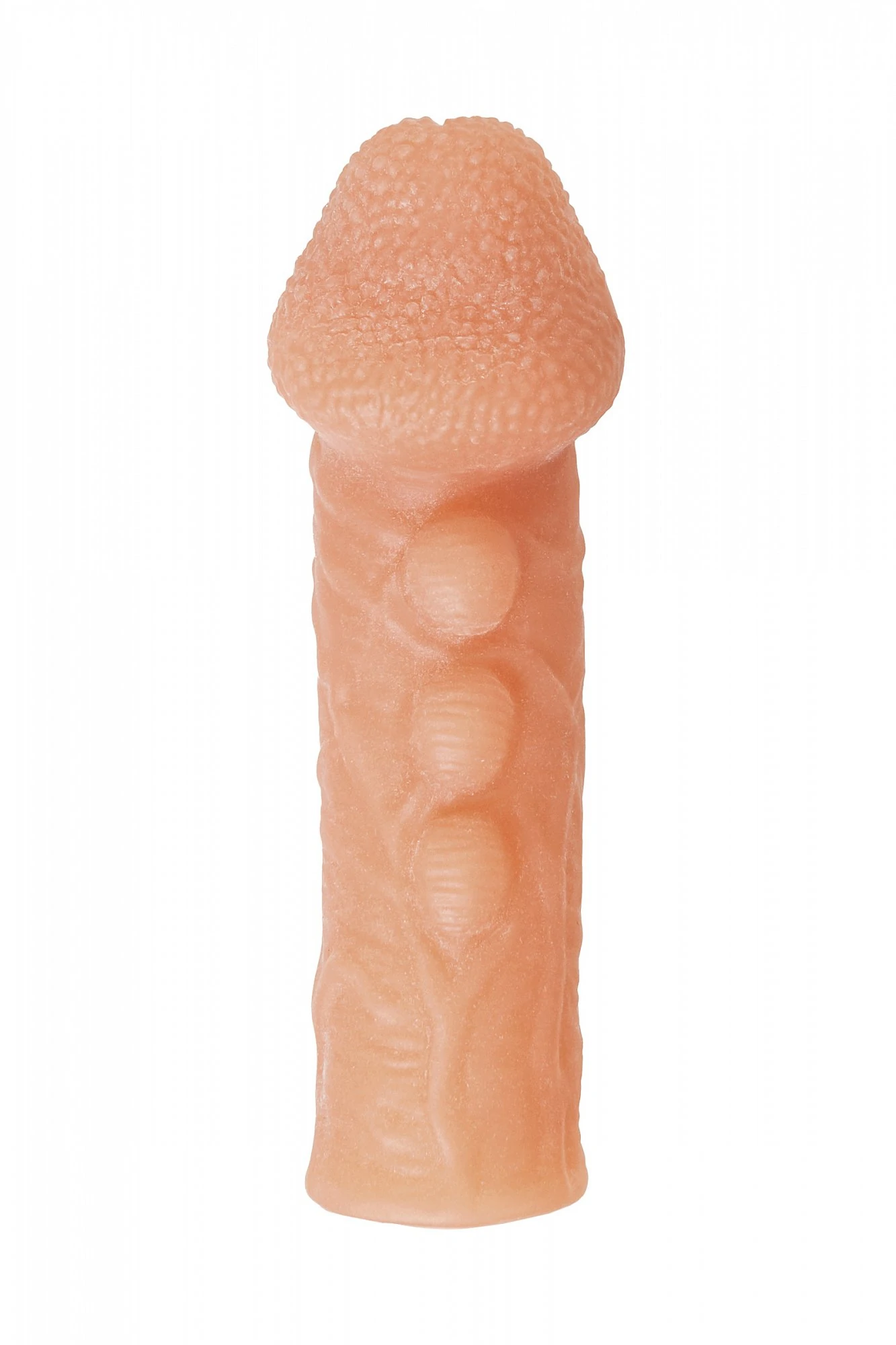 Увеличивающая насадка с изгибом и фантазийным рельефом в виде вен и пупырышек от Kokos открывает новые возможности для взаимного удовольствия. Увеличение продолжительности полового акта у мужчины - задержка эякуляции, и наращивание темпа приближения оргазма у женщины. Насадка придает дополнительный объем и длину половому члену. Мощная головка имеет рельеф из мелких пузырьков и крупный выступ. Выступающие бугорки сверху и снизу очень хорошо стимулируют зону G и вход во влагалище. Контрастный переход от головки к стволу, 3 выпуклости на передней и 4 на задней части насадки, благодаря изогнутой форме, увеличивают силу стимуляции. Размер: 13,8 см, диаметр 3,6 см. Цвет телесный. Для более комфортного использования рекомендуем приобрести смазку на водной основе и очищающий спрей Clear Toy 100 мл для обработки изделия.