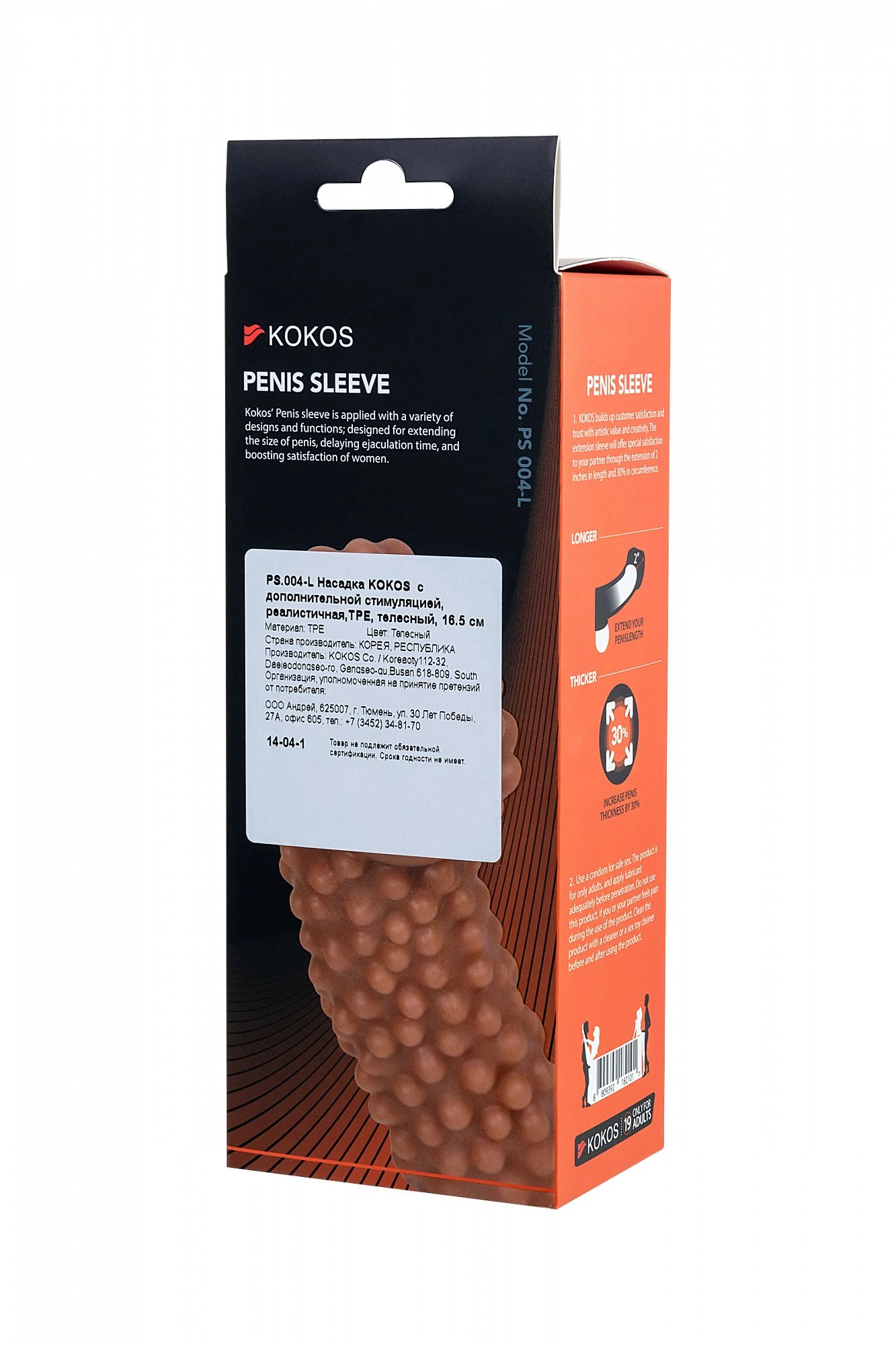 Увеличивающая насадка KOKOS c впечатляющей дополнительной стимуляцией решает сразу 3 задачи: дарит удовольствие обоим партнерам, позволяет экспериментировать с секс-игрушками и выводит интимную жизнь на более высокий уровень. Размер: длина 16,5 см, диаметр от 4,5 до 5,5 см. Цвет телесный. Для более комфортного использования рекомендуем приобрести смазку на водной основе и очищающий спрей Clear Toy 100 мл для обработки изделия.
