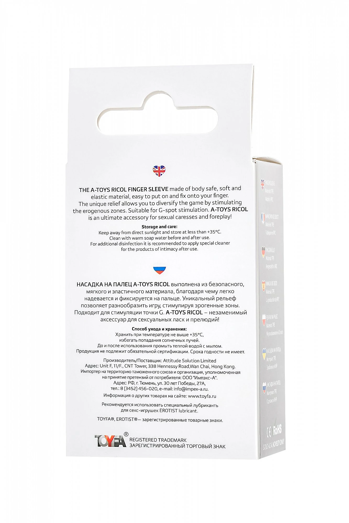 Насадка на палец A-Toys Ricol выполнена из безопасного, мягкого и эластичного материала, благодаря чему легко надевается и фиксируется на пальце. Уникальный рельеф позволяет разнообразить игру, стимулируя эрогенные зоны. Подходит для стимуляции точки G. A-Toys Ricol – незаменимый аксессуар для сексуальных ласк и прелюдий! Размер: общая длина 8 см. Для более комфортного использования рекомендуем приобрести возбуждающую смазку на водной основе и очищающий спрей Clear Toy 100 мл для обработки изделия.