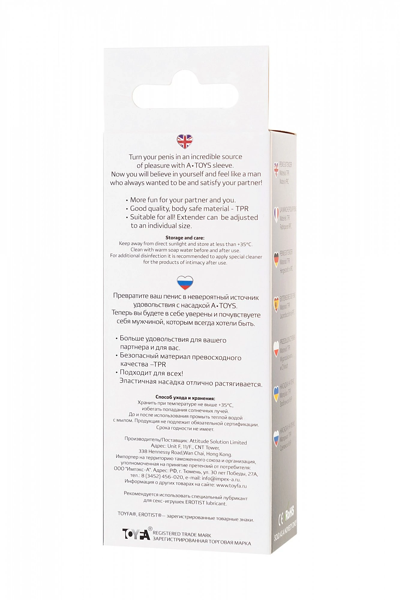 Превратите ваш пенис в невероятный источник удовольствия с насадками A-Toys. Теперь вы будете в себе уверены и почувствуете себя мужчиной, которым всегда хотели быть и удовлетворить своего партнера! Гарантированное и мгновенное увеличение пениса без операций и таблеток! Больше удовольствия для вашего партнера и для вас. Превосходный, безопасный материал TPR. Подходит для всех! Эластичная насадка отлично растягивается.
