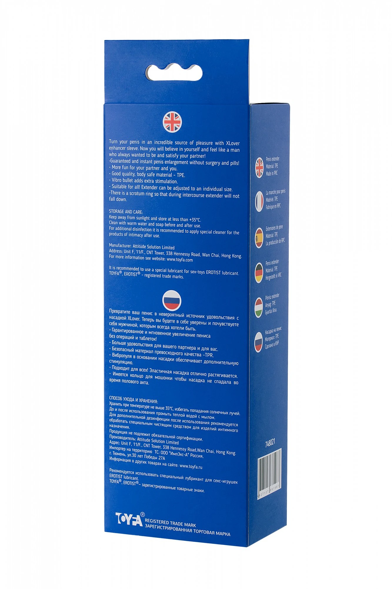 Превратите ваш пенис в невероятный источник удовольствия с насадкой XLover. Теперь вы будете в себе уверены и почувствуете себя мужчиной, которым всегда хотели быть! Гарантированное и мгновенное увеличение пениса без операций и таблеток на 5 см к длине! Больше удовольствия для вашего партнера и для вас. Превосходный, безопасный материал –TPR. Вибропуля в основании насадки обеспечивает дополнительную стимуляцию. Подходит для всех! Эластичная насадка отлично растягивается. Имеется кольцо для мошонки.