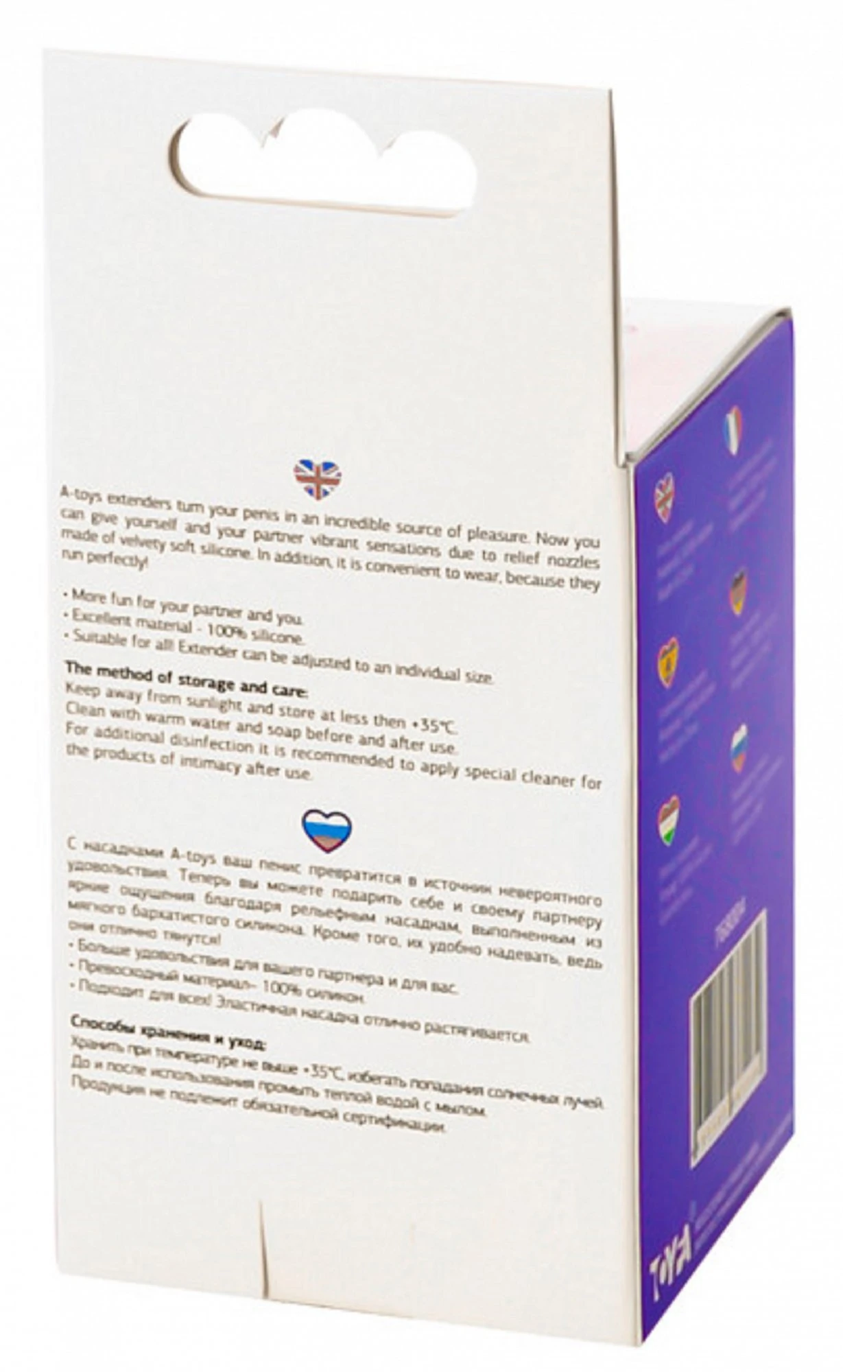С насадками A-toys ваш пенис превратится в источник невероятного удовольствия. Теперь вы можете подарить себе и своему партнеру яркие ощущения благодаря рельефным насадкам, выполненным из мягкого бархатистого силикона. Кроме того, ее удобно надевать, ведь она отлично тянется! Превосходный материал – 100% силикон. Подходит для всех! Эластичная насадка отлично растягивается. Размер: длина 7,5 см диаметр 3,5 см. Для более комфортного использования рекомендуем приобрести смазку на водной основе.