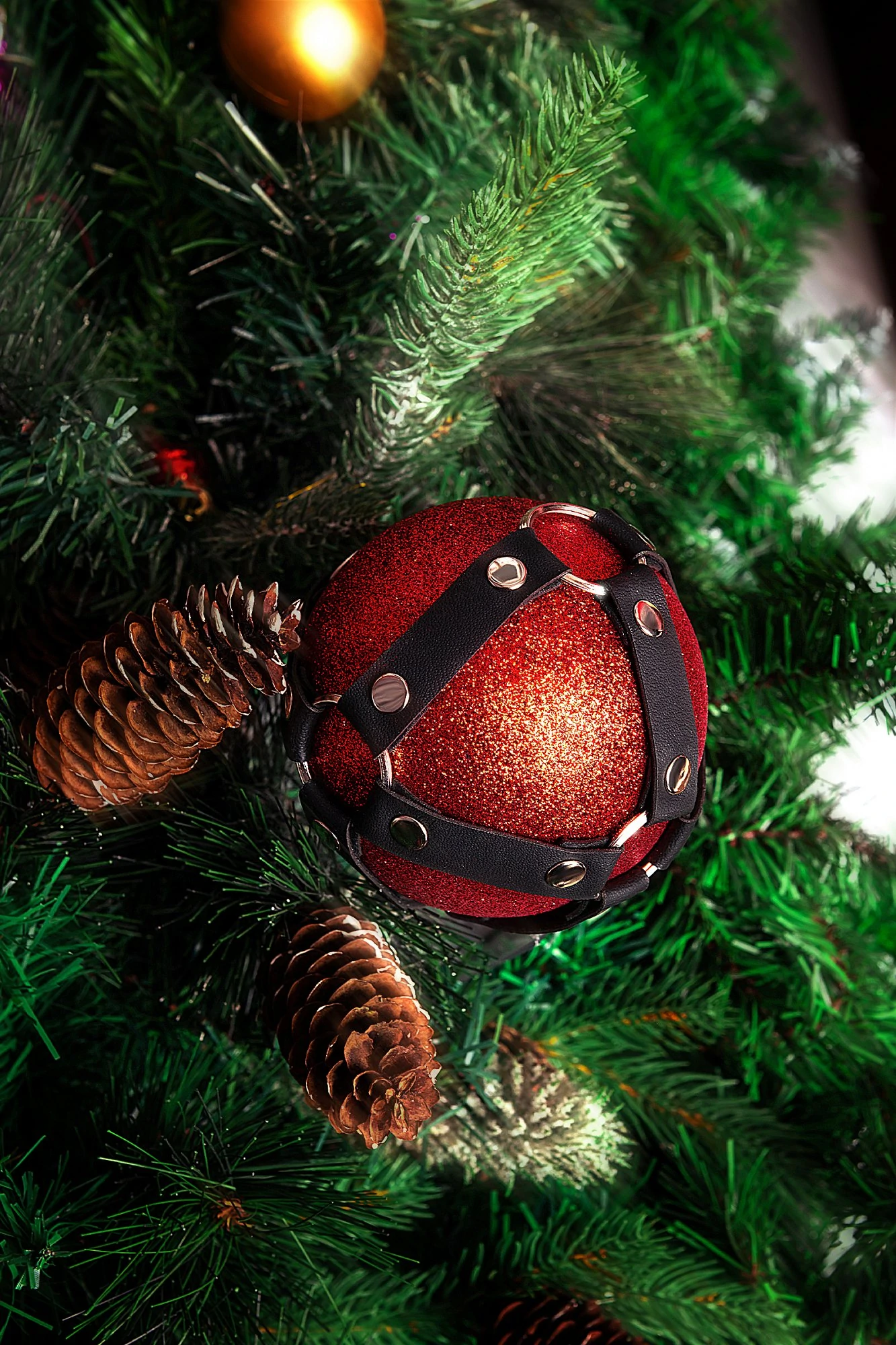 Пусть ваша елочка оденет свой самый лучший костюм. Конечно же, в стиле БДСМ! Блестящий прочный шар гранатово-красного цвета изготовлен из качественного пластика. Ремни по всей поверхности выполнены из натуральной, экологичной кожи. 22 элемента металлической фурнитуры окунают в атмосферу господства и повиновения. Благодаря универсальному размеру шара 10 см, он отлично смотрится и на миниатюрных, и на больших елочках. Мимо таких возбуждающих украшений никто не сможет пройти спокойно!