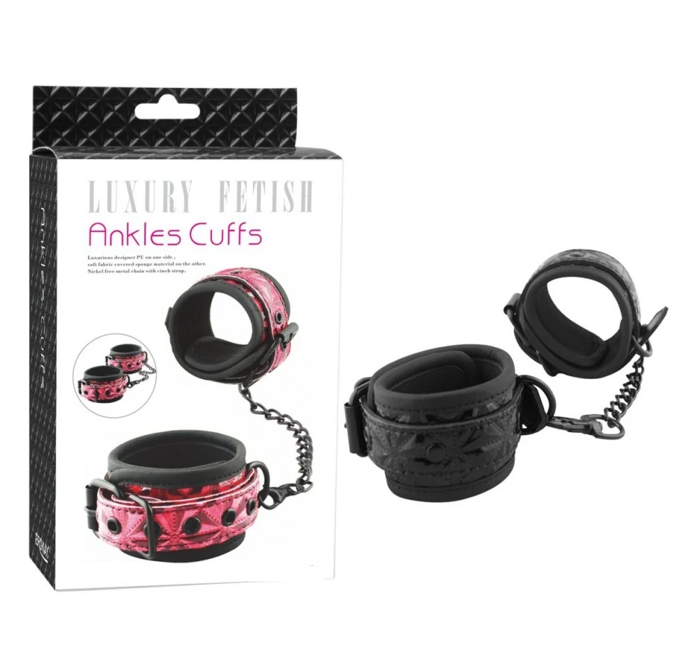 Оковы изготовлены из комбинированного материала, а именно искусственной кожи и винила, соединительная цепочка и дополнительные фиксирующие приспособления из металла. Главная сторона имеет яркую отделку узором, похожим на грани драгоценного камня, которые при поподании света переливаются, благодаря лаковому напылению. Ширина ручной манжеты 5,5 см, длина 26,5 см. Регулировочный ремень с застежкой имеет ширину 2,5 см и длину около 36,5 см. Длина цепочки между манжетами, включая карабин 17 см.