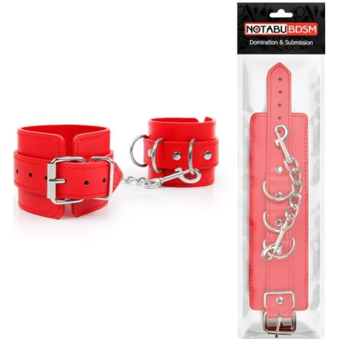 Размер наручников регулируется с помощью ремней. В комплект входит прочная металлическая цепочка, которой при необходимости можно соединить наручники. Внешняя сторона наручников оснащена тремя кольцами, которые можно испольцовать для дополнительной сцепки с другими бондажными приспособлениями.