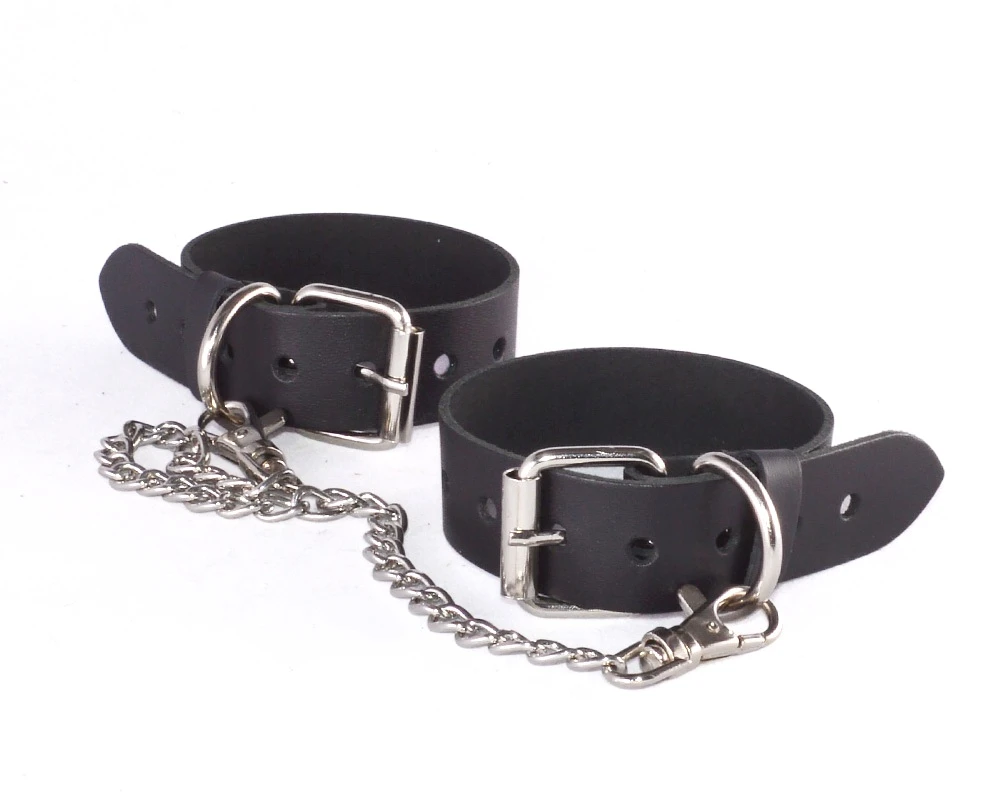 Оковы изготавливаются из натуральной кожи. Регулируются пряжкой. Соединяются между собой цепочкой длиной 35 см с двумя карабинами на концах. Не нарушают кровообращение. Размер: длина 30 см, ширина ремешка 2,5 см. Цвет черный.