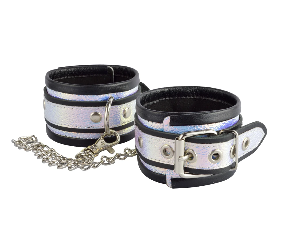Потрясающе эффектные оковы от Sitabella,из натуральной черной кожи с декоративной голграфической отделкой из искусственной кожи, окунут Вас в безграничный и эпатажный мир BDSM. Изготовлены оковы из натуральной высококачественной кожи чёрного цвета. Для соединения оков используется цепочка с карабином, который крепится к полукольцам. Вся металлическая фурнитура имеет никелевое покрытие. Длина оков с цепью 54 см, ширина 5,2 см.