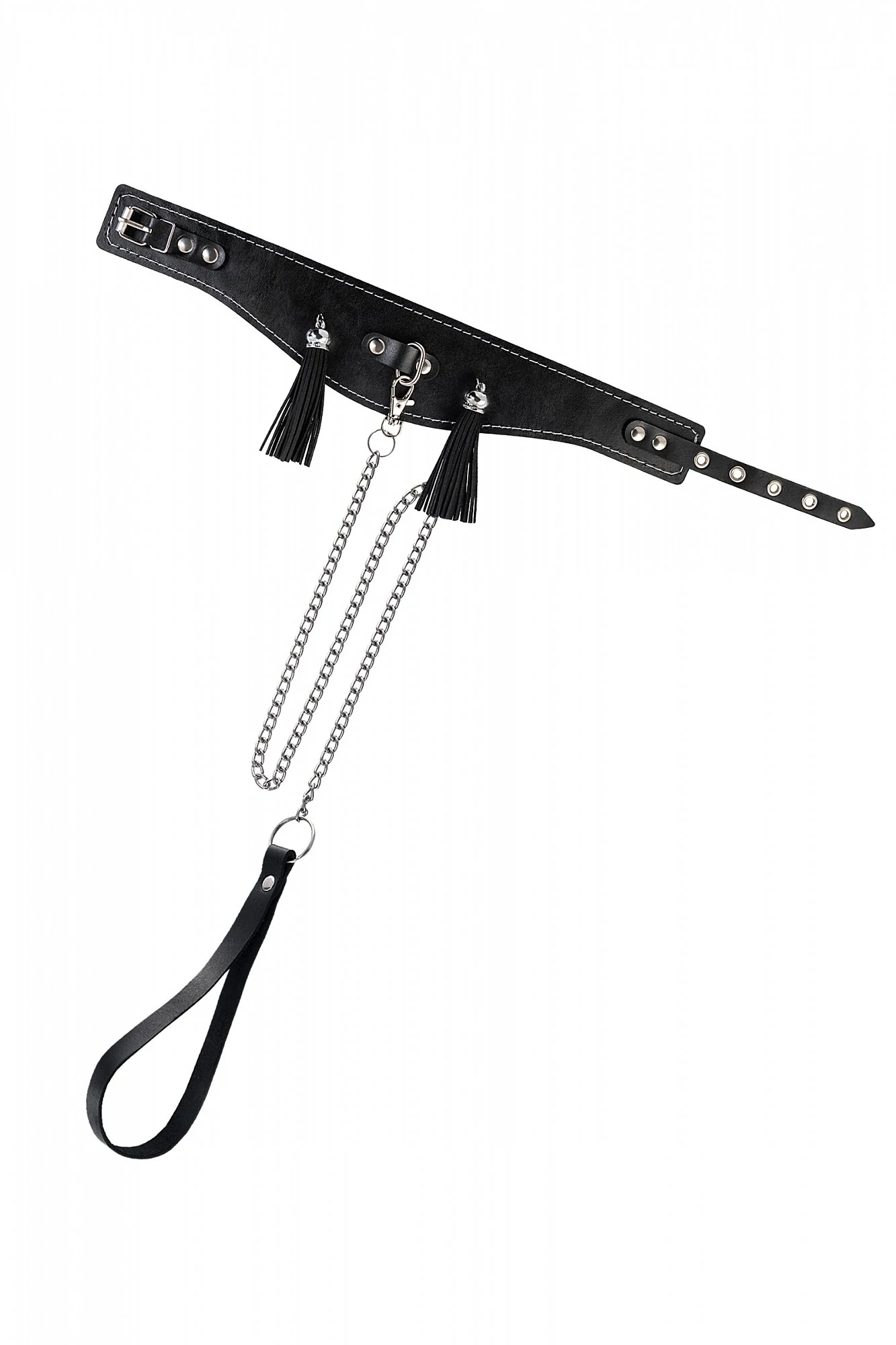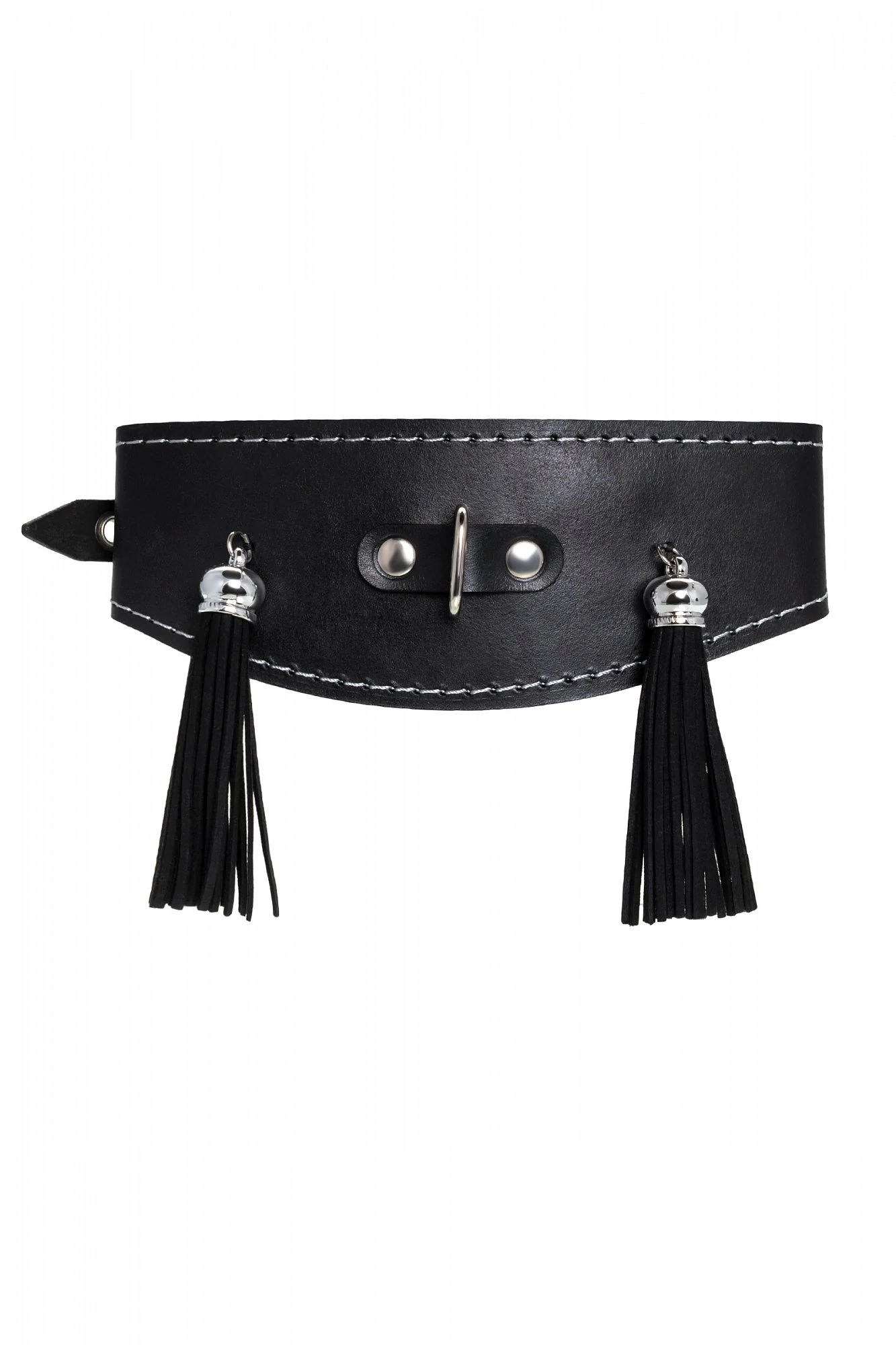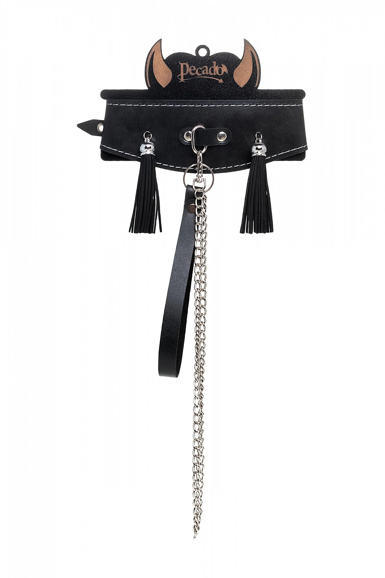 Оригинальный дизайнерский ошейник из натуральной кожи с кисточками производства Pecado BDSM с металлическим поводком может стать отличным дополнением в БДСМ-образ. Ошейник может выполнять не только свою первичную функцию - без поводка аксессуар послужит своеобразным украшением и добавит страсти в образ. Добавьте пикантную деталь в ролевую игру и воплотите самую смелую сексуальную фантазию в реальность - взрослые игры для взрослых. Поводок в виде цепочки имеет ручку-петельку для удобства хозяина и крепится надежным стальным карабином к кольцу на ошейнике. Легко отстегивается и превращает ошейник в чокер, который легко вписать в любой образ. К металлическому кольцу также можно присоединить и другие аксессуары при помощи карабинов. Благодаря универсальному размеру ошейник может использоваться как женщинами, так и мужчинами – размер легко регулируется с помощью металлической пряжки, органично вписывающейся в общий стиль. Размер: ширина 4-7 см, длина 38 см, длина поводка 80 см.