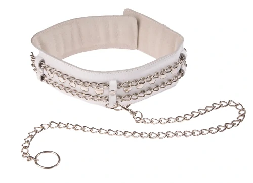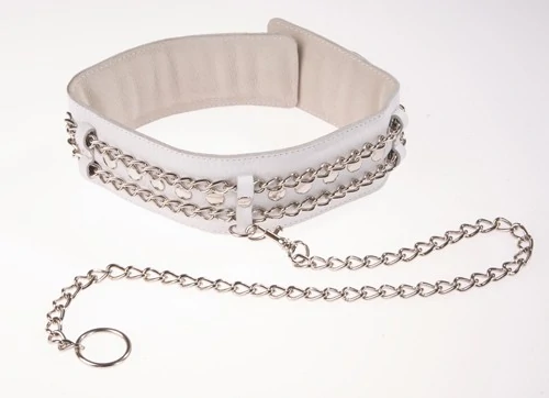 Изготовлен из натуральной кожи с велюровой подкладой. При изготовлении использована никелированная фурнитура. Ширина ошейника 5 см, длина цепочки поводка с карабином 50 см. Размер универсальный.