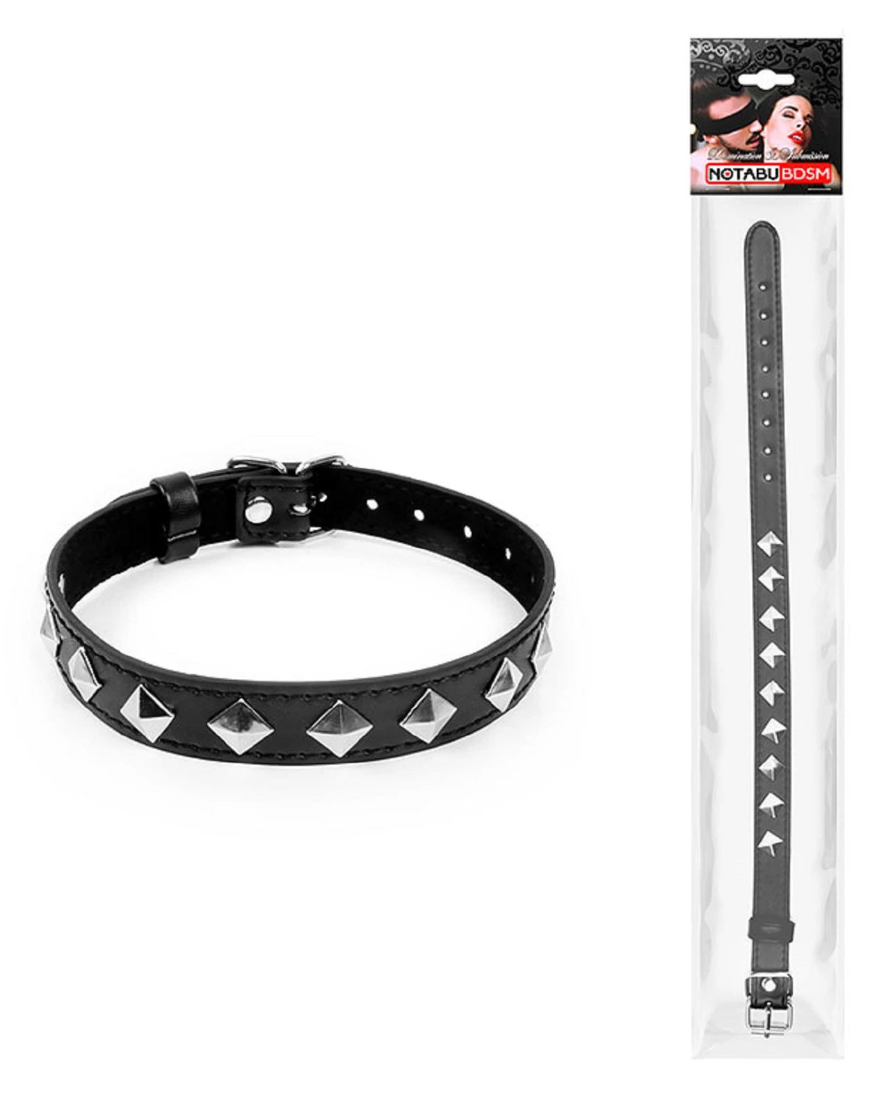 Оригинальный ошейник для любителей БДСМ-игр, декорированный металлическими украшениями. Имеет возможность регулировки размера с помощью ремешков.