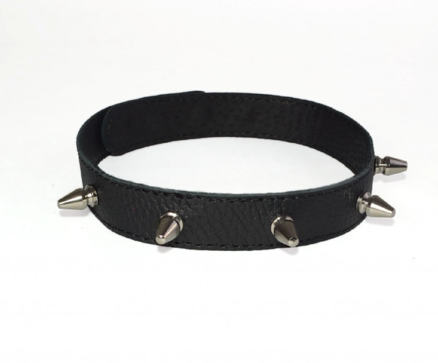 Изготовлен из натуральной кожи с велюровой подкладой. При изготовлении использована никелированная фурнитура. Ширина ошейника 20 мм, длина шипов 12 мм. Размер универсальный, регулируется при помощи кнопок. Один из основных атрибутов BDSM.