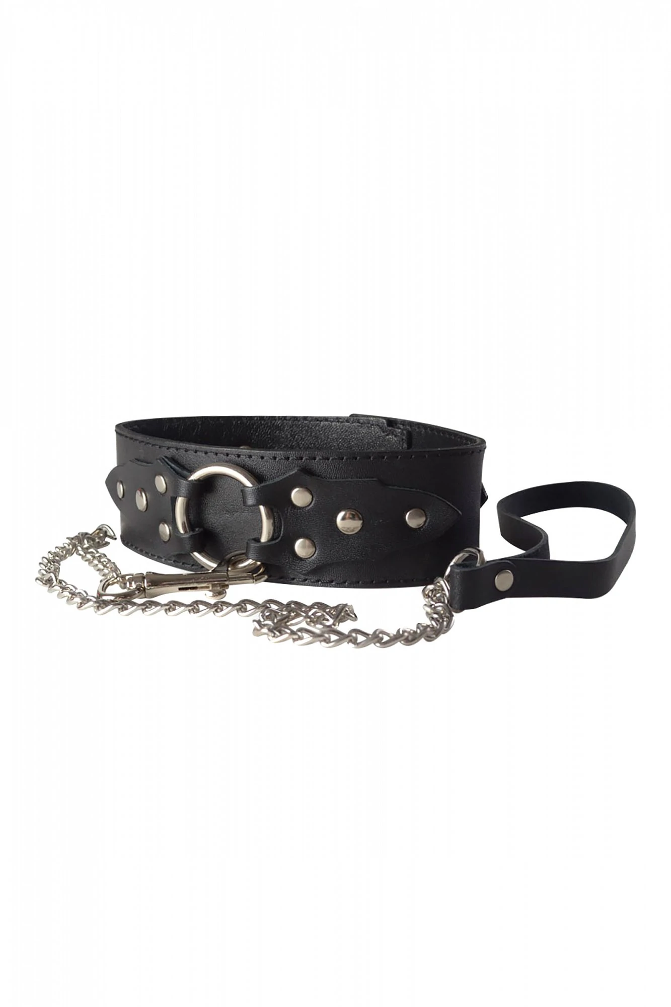 Кожаный ошейник в готическом стиле от Sitabella – это строгий и лаконичный аксессуар BDSM, способный вызвать эмоционально-сексуальное возбуждение, лишь своим нахождением на теле секс-партнёра. Чёрный ошейник из толстой натуральной кожи, ширина которого составляет 4,8 см, имеет внутреннюю подкладу из тонкой кожи. Так как ошейник достаточно широкий, хорошо просматривается текстура натуральной кожи, в виде мелкой паутинки. Декоративным элементом данного аксессуара, является металлическое кольцо, удерживаемое двумя кожаными узорчатыми накладка, оно также используется для присоединения поводка-цепочки к ошейнику. Длина поводка-цепочки 85 см. Размер изделия регулируется металлической пряжкой.Размер: общая длина ошейника 42 см, ширина 4,8 см. Цвет черный.