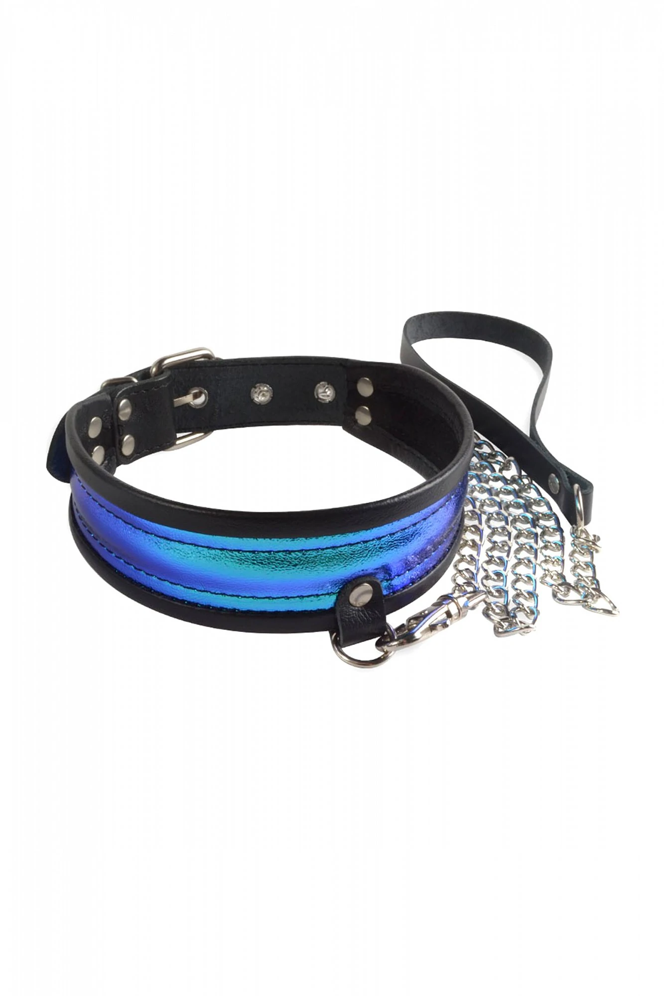 Фантастически яркий, эффектный и безумно сексуальный ошейник от Ситабелла привнесет в Ваши эротические отношения фейерверк незабываемых ощущений. Натуральная черная кожа, из которой изготовлен ошейник, декорирована голографической вставкой, преобладающим цветом которой, является синий. При различном освещении и смене декораций будет меняться цвет ошейника, отражая пространство, могут появится такие цвета как, бирюзовый, фиолетовы, изумрудный. Эта завораживающая смена цветов отразится страстным влечением партнёра и незабываемыми ощущениями. Легко зафиксировать девайс на шее и отрегулировать размер можно при помощи пряжки. Торцы ошейника отделаны оторочкой, что придает краю скругленный вид. Для управления секс-партнёром к ошейнику, при помощи карабина, крепится поводок-цепочка около 1 м. Для удобного использования, на поводке имеется кожаный ремешок-петля для запястья. Размер: ширина ошейника 3,8 см, длина 42 см.