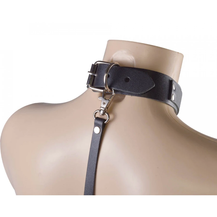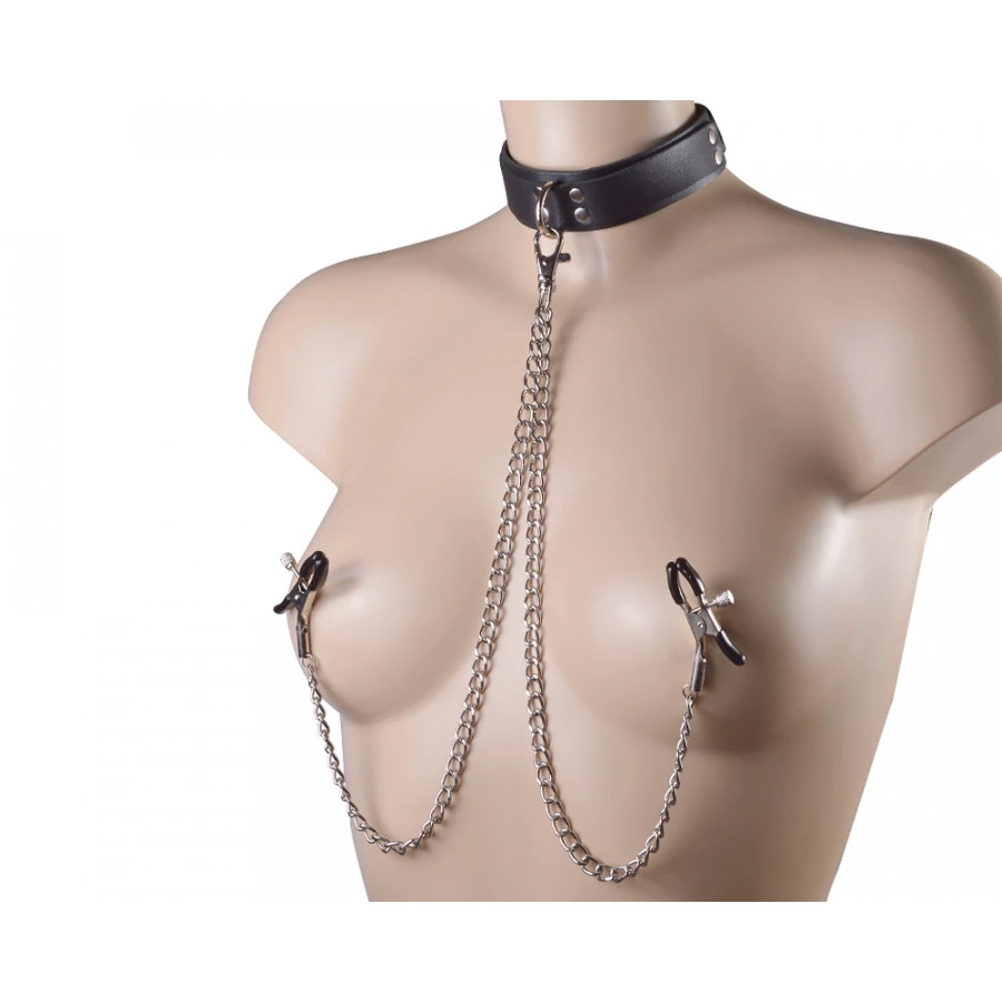 Кожаный ошейник Sitabella с зажимами на соски – это строгий и лаконичный аксессуар BDSM, способный вызвать эмоционально-сексуальное возбуждение, лишь своим нахождением на теле секс-партнёра. Ошейник с зажимами на соски изготовлен из натуральной кожи с применением никелированной фурнитуры, декорирован клепками. Регулируется ошейник при помощи пряжки, что позволяет оптимально подобрать размер. Зажимы оснащены пружинным механизмом, за счет чего легко и удобно фиксируются на месте, винтики позволяют отрегулировать степень давления в соответствии с индивидуальными предпочтениями. Небольшой поводок с карабином и кольцом. Цвет черный. Размер: длина изделия 44 см, ширина 3 см, длина поводка 36 см, длина цепочек с зажимами 42 см.